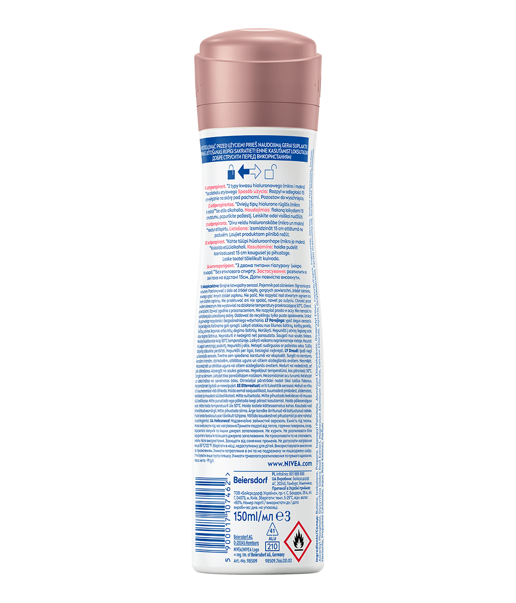Zawiera: Butane, Isobutane, Propane, Isopropyl Palmitate, Aluminum Chlorohydrate, Dicaprylyl Ether, Caprylic/Capric Triglyceride, Glycine, Sodium Hyaluronate, Sodium Ascorbyl Phosphate, Glycyrrhiza Glabra Root Extract, Magnesium Aluminum Silicate, Calcium Chloride, Glycerin, Octyldodecanol, Persea Gratissima Oil, Tocopherol, Disteardimonium Hectorite, Propylene Carbonate, Aqua, Rose Ketones, Parfum