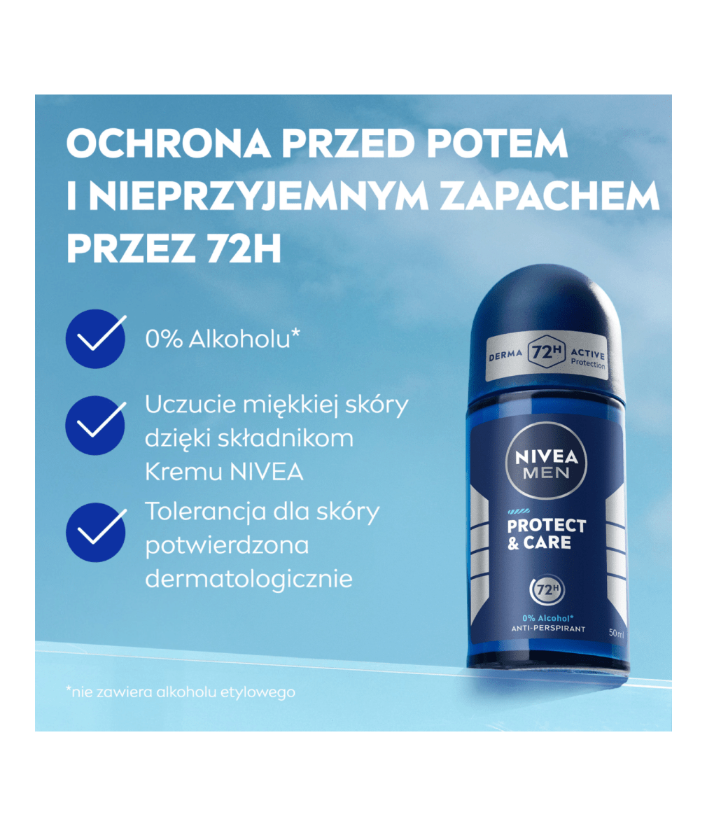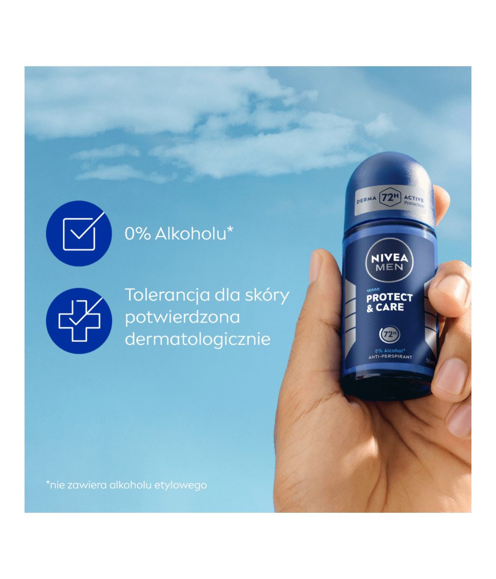 NIVEA MEN Antyperspirant Protect & Care w kulce to skuteczna 72h ochrona przed poceniem i sprawdzona pielęgnacja skóry. Pozostawia na skórze przyjemny, męski zapach. Nie podrażnia skóry i nie zawiera alkoholu etylowego.