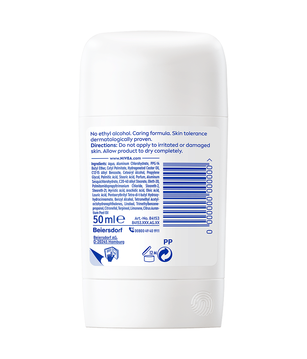 Zawiera: Aqua, Aluminum Chlorohydrate, PPG-14 Butyl Ether, Cetyl Palmitate, Hydrogenated Castor Oil, C12-15 Alkyl Benzoate, Cetearyl Alcohol, Propylene Glycol, Palmitic Acid, Stearic Acid, Parfum, Aluminum Sesquichlorohydrate, C20-40 Alkyl Stearate, Oleth-20, Palmitamidopropyltrimonium Chloride, Steareth-2, Steareth-21, Myristic Acid, Arachidic Acid, Oleic Acid, Lauric Acid, Pentaerythrityl Tetra-di-t-butyl Hydroxyhydrocinnamate, Benzyl Alcohol, Tetramethyl Acetyloctahydronaphthalenes, Linalool, Trimethylbenzenepropanol, Citronellol, Terpineol, Limonene, Citrus Aurantium Peel Oil