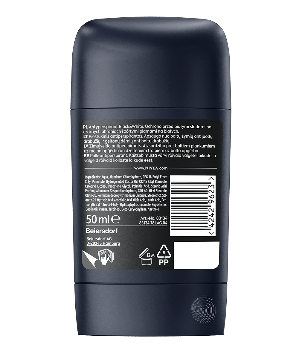 Antyperspirant w sztyfcie Black & White Original zapewnia niezawodną ochronę 5w1 przed nieprzyjemnym zapachem, potem, podrażnieniami, żółtymi plamami na białych ubraniach i białymi śladami na czarnych ubraniach. Niezawodna, 72-godzinna ochrona, która jednocześnie pielęgnuje Twoją skórę.
