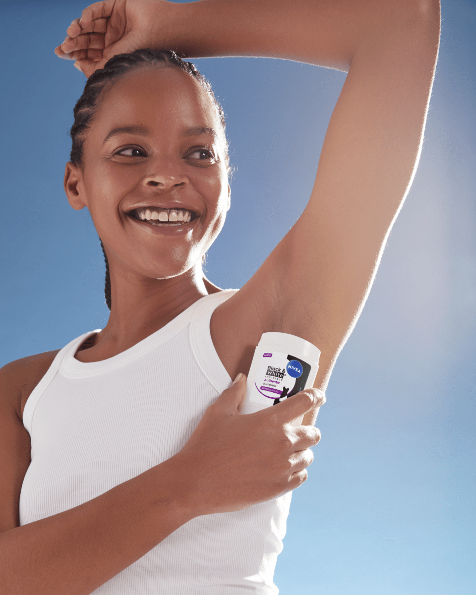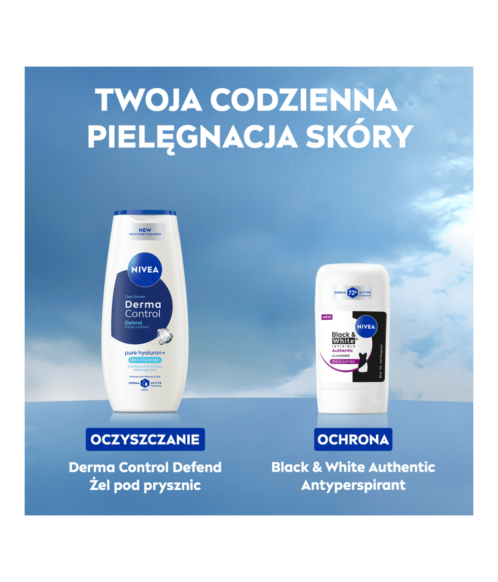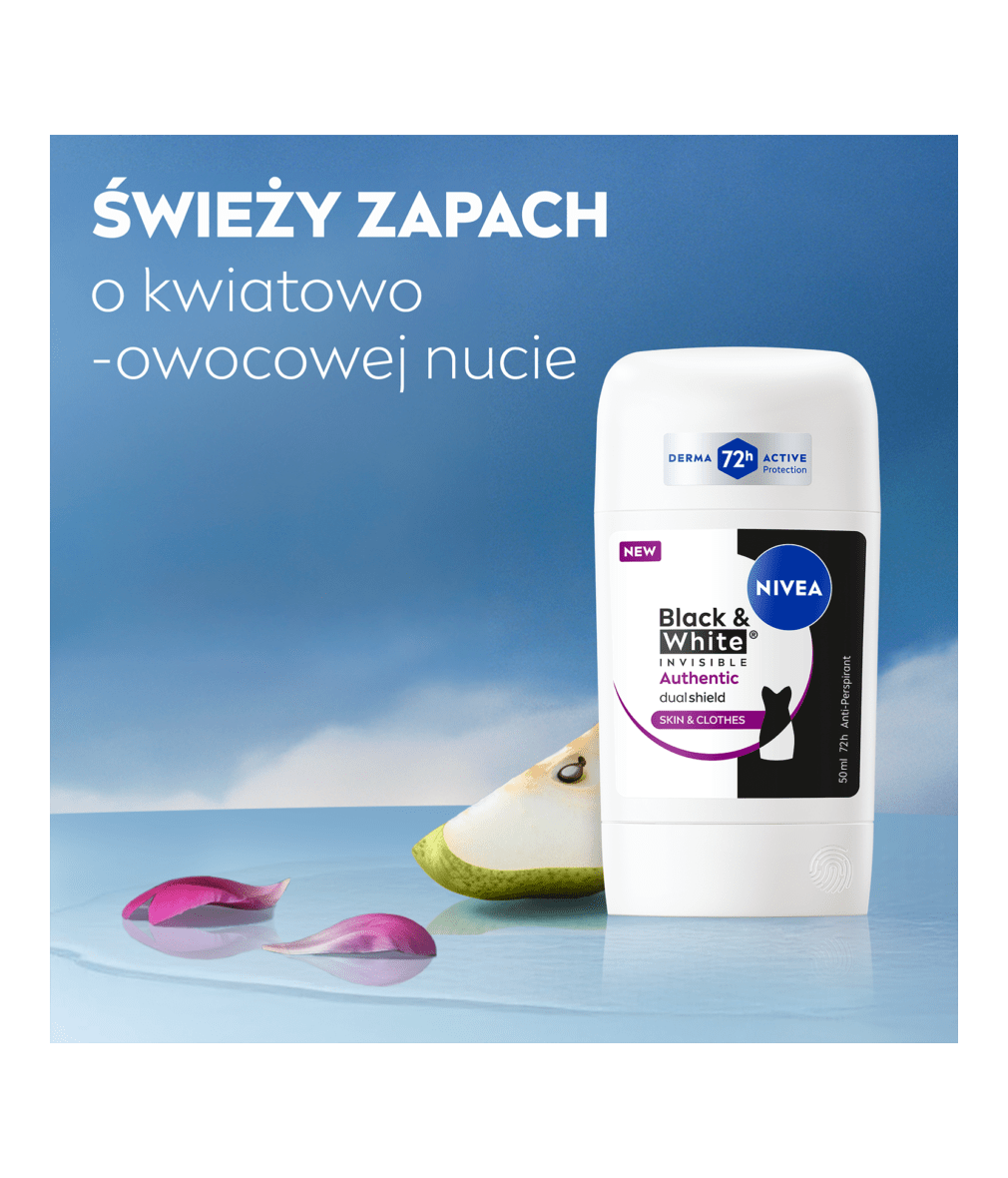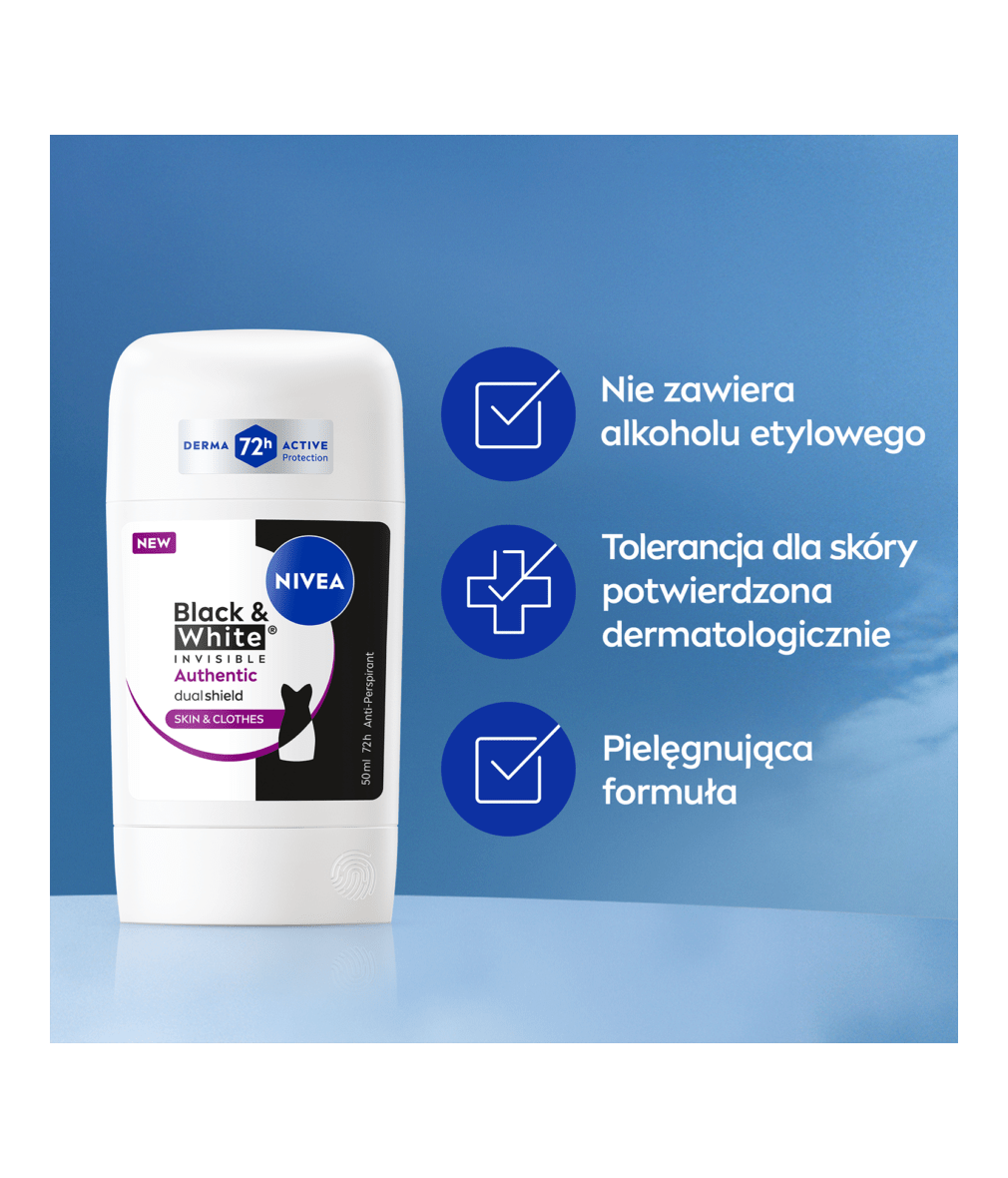 NIVEA Black & White Invisible Authentic z technologią dual shield zapewnia niezawodną ochronę przed nieprzyjemnym zapachem, potem, podrażnieniami, żółtymi plamami na białych ubraniach i białymi śladami na czarnych ubraniach. Niezawodna, 72-godzinna ochrona, która jednocześnie pielęgnuje Twoją skórę.