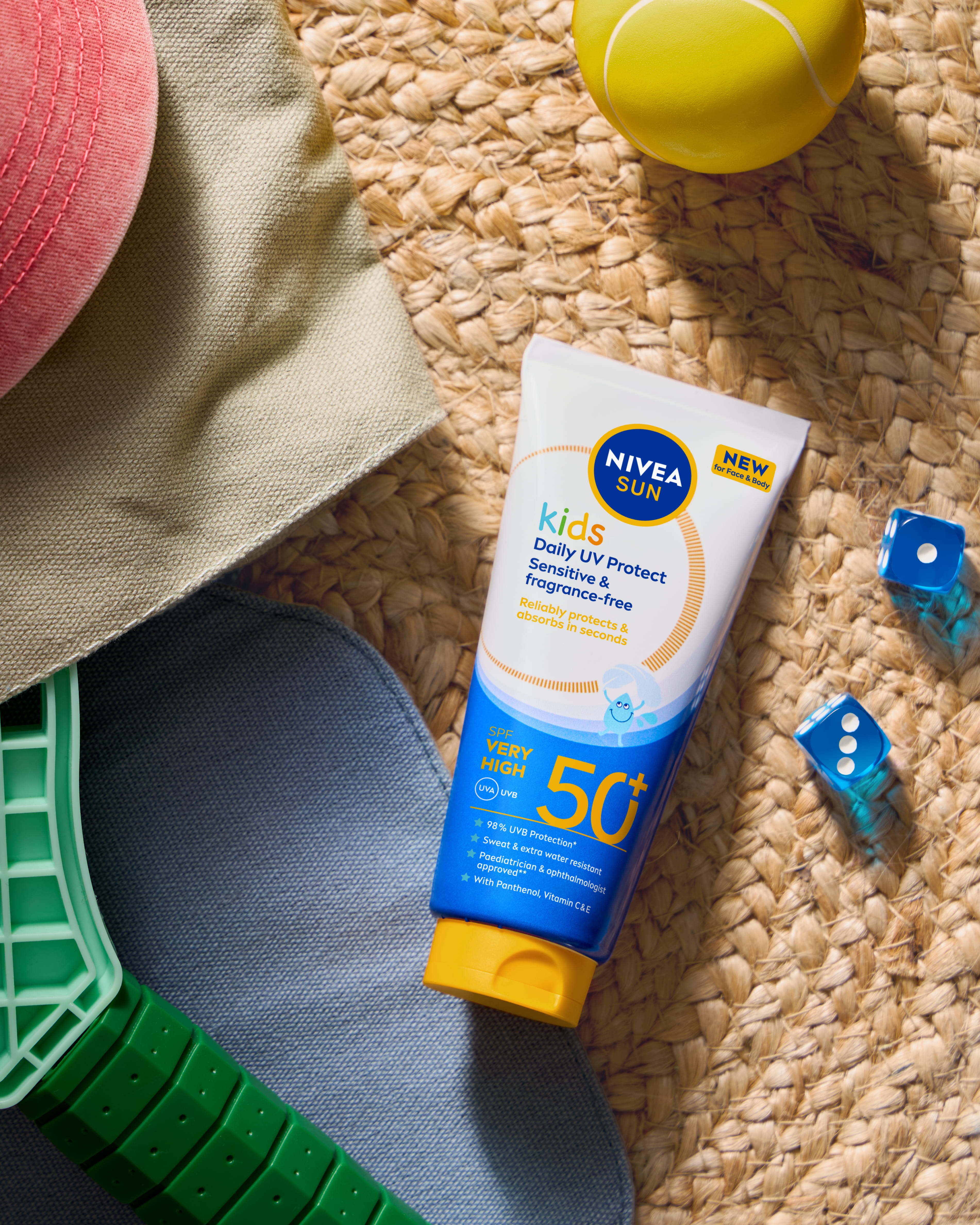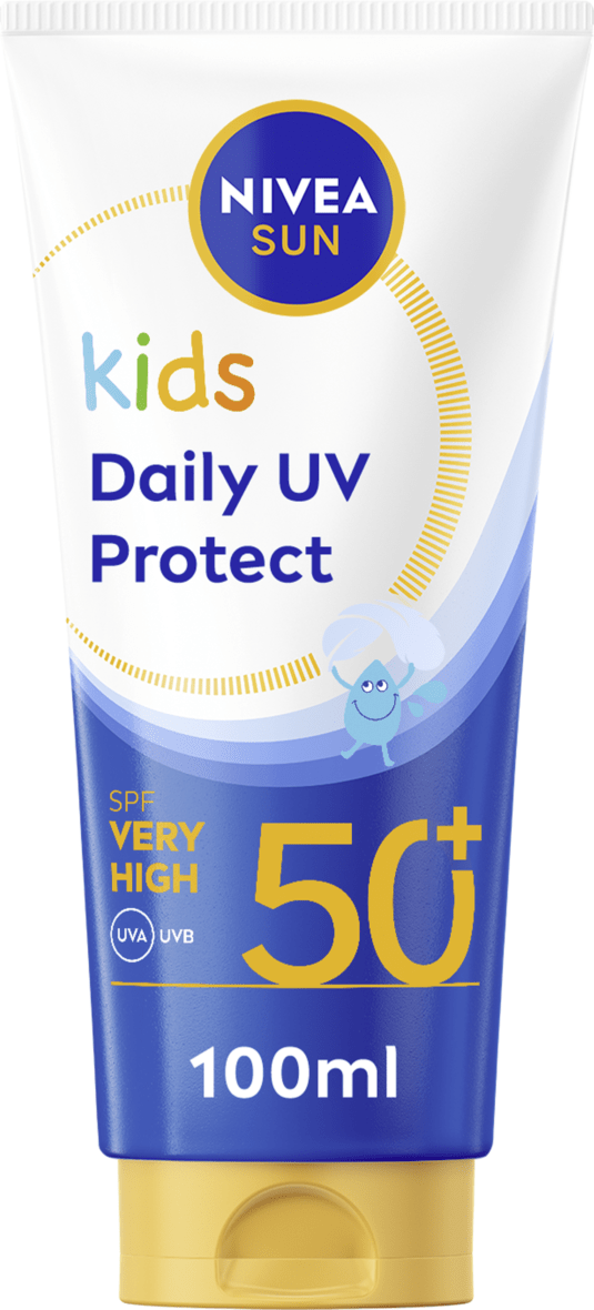 NIVEA SUN Kids Daily UV Protect SPF 50+ zapewnia bardzo wysoką ochronę przed promieniowaniem UVA i UVB, chroniąc delikatną skórę dzieci podczas zabawy na słońcu. Pielęgnująca formuła z pantenolem oraz witaminami C i E wchłania się w kilka sekund, pozostawiając skórę miękką i nawilżoną.