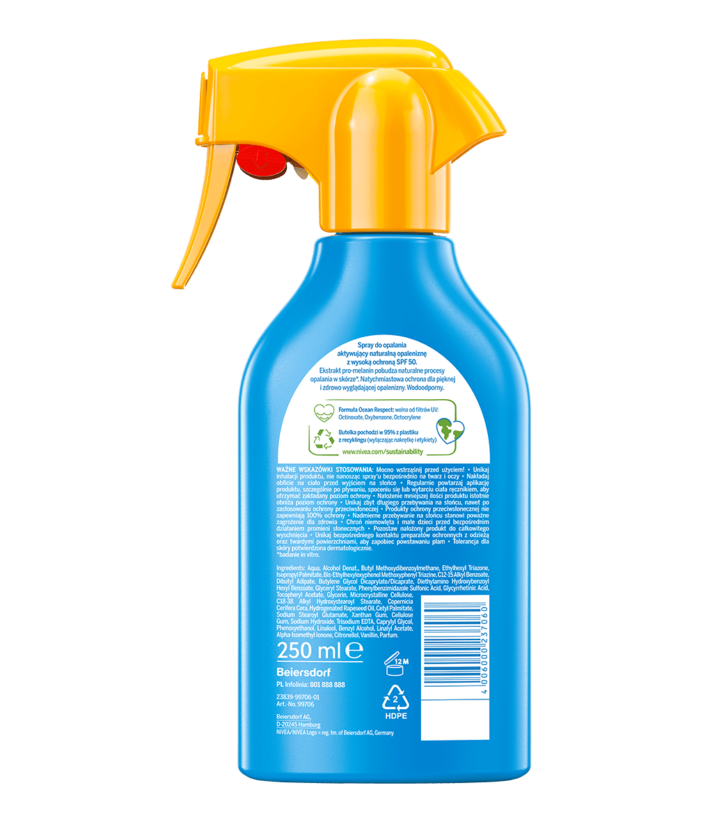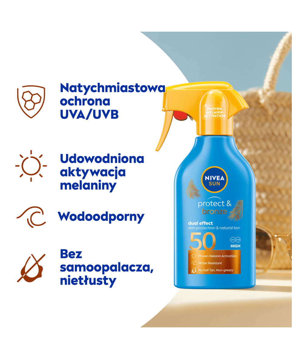 NIVEA SUN Balsam w sprayu Protect & Bronze SPF 50 zapewnia natychmiastową ochronę UV, wspierając naturalną melaninę skóry. Dzięki temu skóra zyskuje piękną, zdrowo wyglądającą opaleniznę.