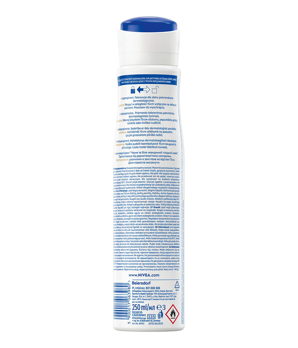 Antyperspirant NIVEA Black&White Invisible Silky Smooth 250 ml zapewnia niezawodną ochronę 5w1 przed nieprzyjemnym zapachem, potem, podrażnieniami, żółtymi plamami na białych ubraniach i białymi śladami na czarnych ubraniach. Niezawodna, 72-godzinna ochrona, która pielęgnuje Twoją skórę.