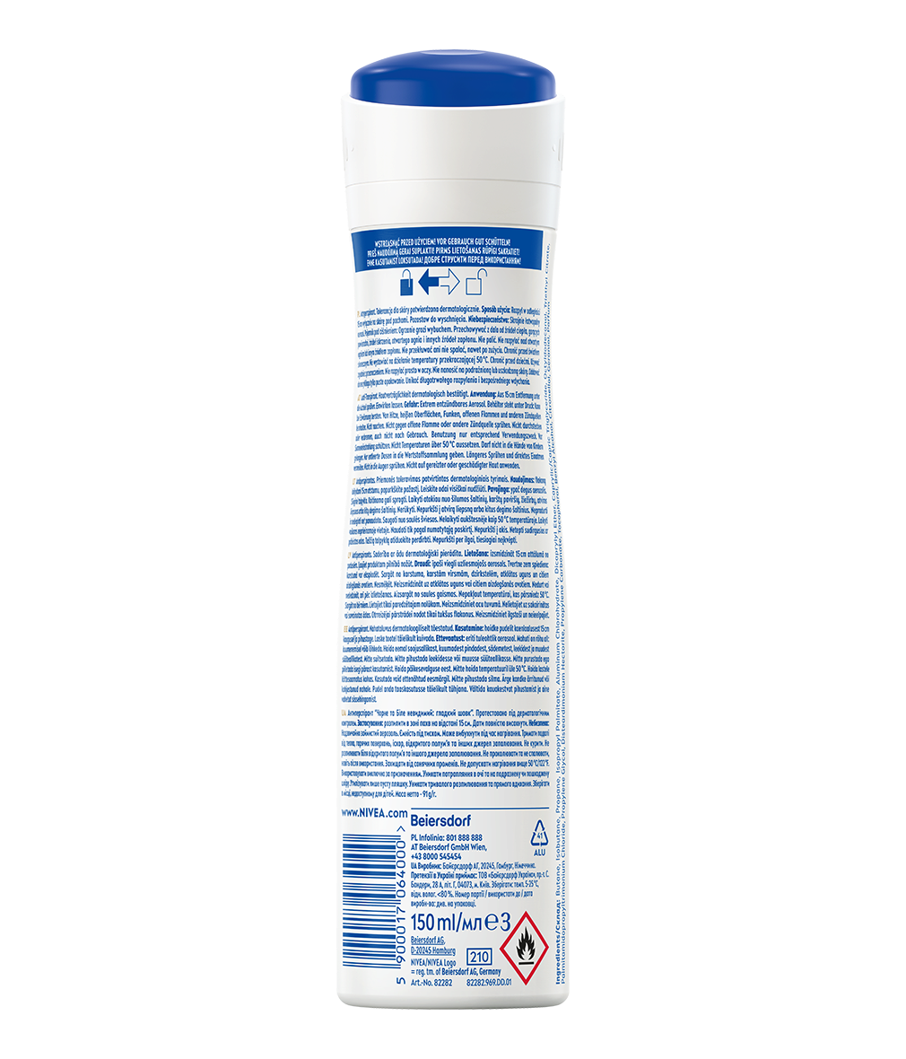 Antyperspirant NIVEA Black&White Invisible Silky Smooth zapewnia niezawodną ochronę 5w1 przed nieprzyjemnym zapachem, potem, podrażnieniami, żółtymi plamami na białych ubraniach i białymi śladami na czarnych ubraniach. Niezawodna, 72-godzinna ochrona, która jednocześnie pielęgnuje Twoją skórę.