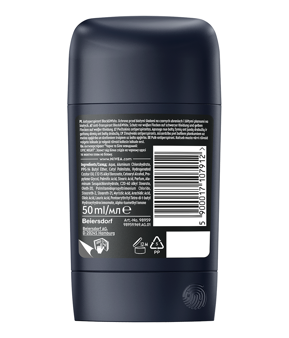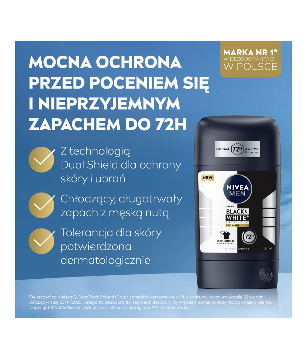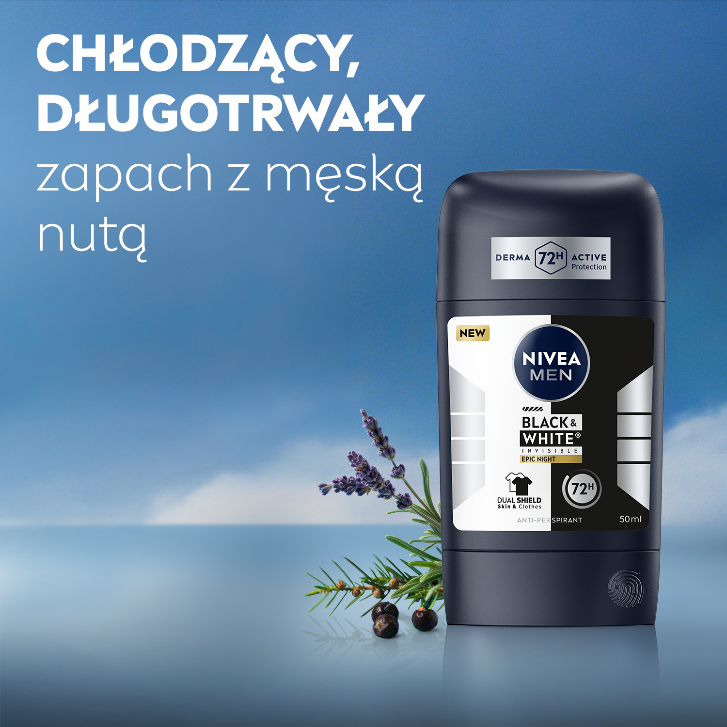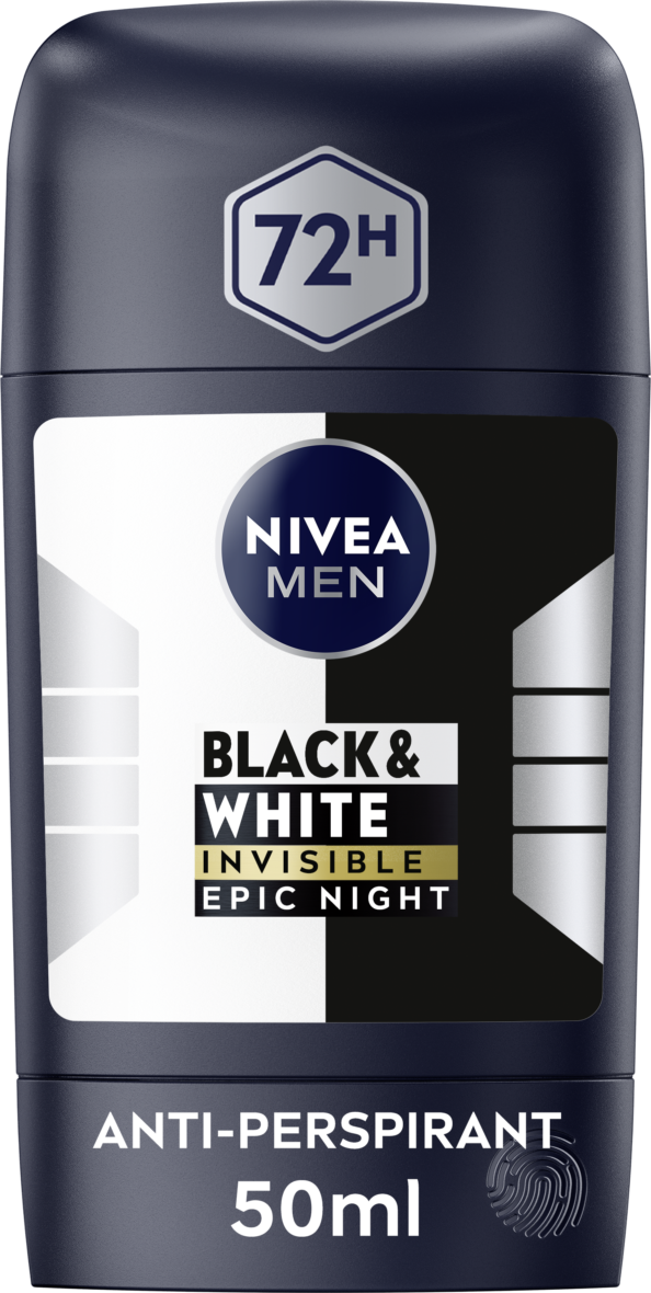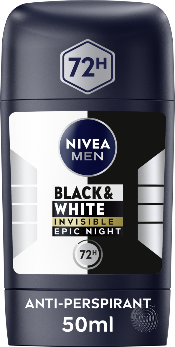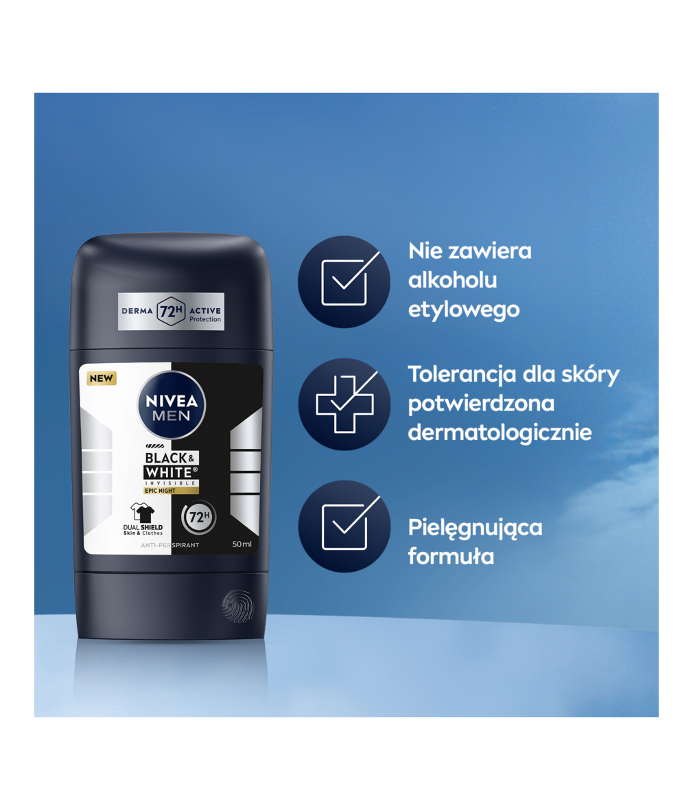 NIVEA Black & White Invisible Epic NIght. Technologia dual shield zapewnia ochronę przed białymi śladami na czarnych ubraniach i żółtymi plamami na białych. Niezawodna, 72-godzinna ochrona, która jednocześnie pielęgnuje Twoją skórę.