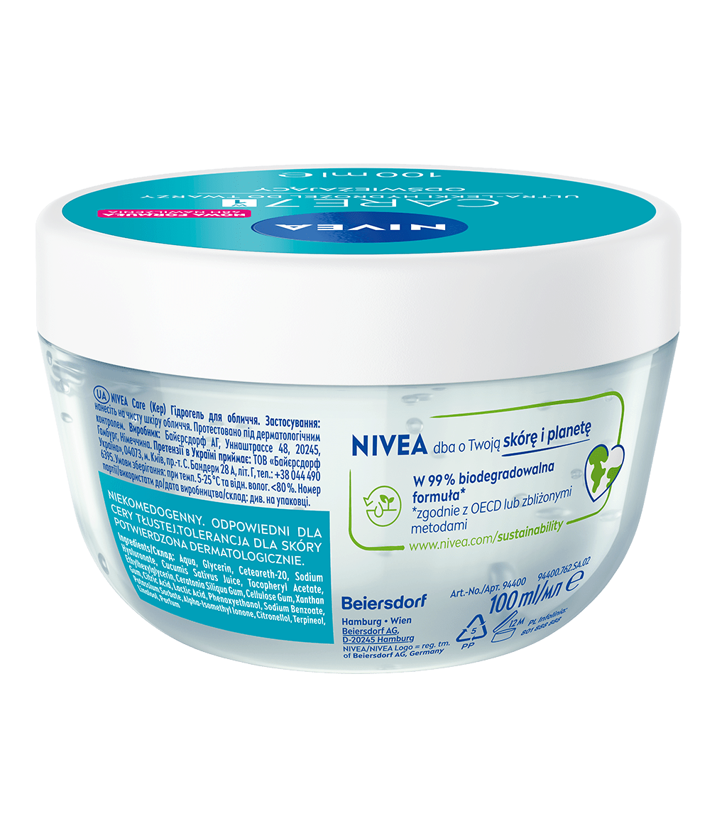 NIVEA CARE 7w1 Hydrożel Odświeżający to ultra-lekki żel do twarzy o formule z kwasem hialuronowym. Odświeża skórę i intensywnie ją nawilża przez 48h - bez zatykania porów i bez lepkiego uczucia na skórze. Żel do twarzy sprawia, że cera wygląda zdrowo i świeżo.