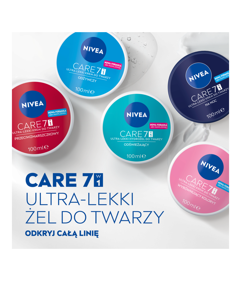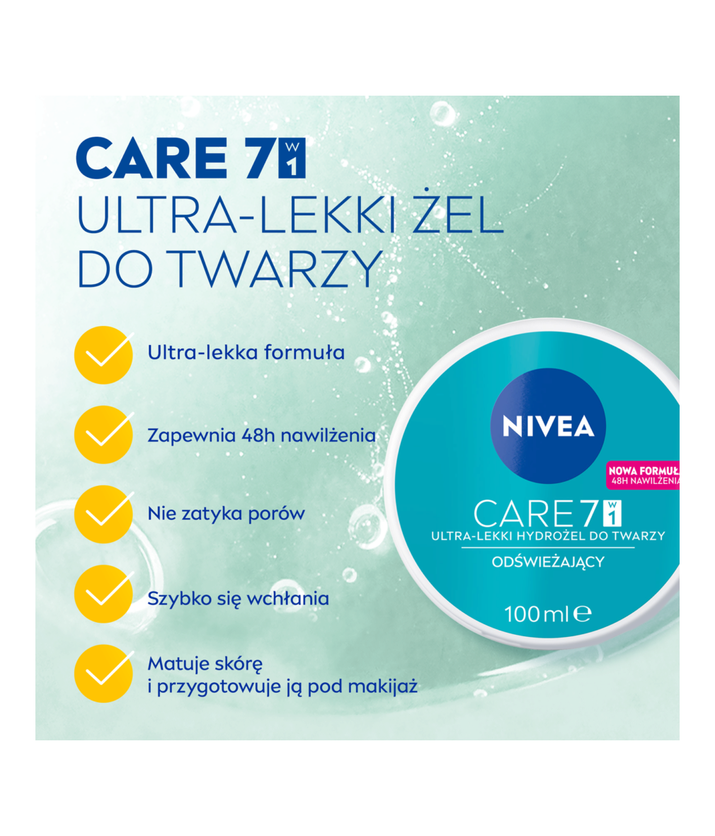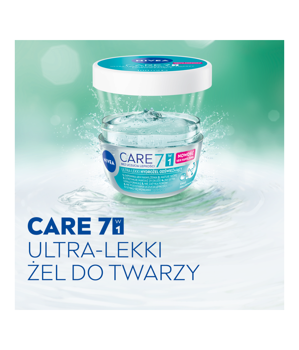 NIVEA CARE 7w1 Hydrożel Odświeżający to ultra-lekki żel do twarzy o formule z kwasem hialuronowym. Odświeża skórę i intensywnie ją nawilża przez 48h - bez zatykania porów i bez lepkiego uczucia na skórze. Sprawia, że cera wygląda zdrowo i świeżo.