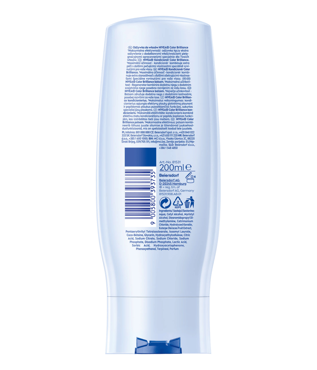 Odżywka do włosów chroniąca kolor NIVEA Color Brilliance. Intensywnie pielęgnuje farbowane włosy. Formuła z ekstraktem z jagód Acai i keratyną sprawia, że włosy są lśniące i pełne kolorów. Formuła odżywki nie zawiera silikonu.