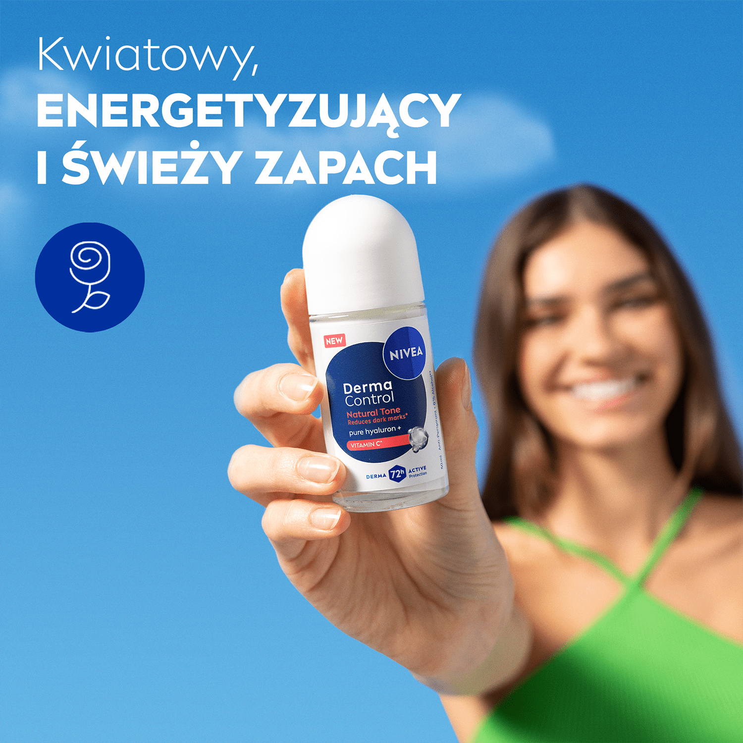 Linia NIVEA Derma Control Natural Tone, z czystym kwasem hialuronowym i witaminą C^, redukuje ciemne ślady i przywraca równomierny koloryt skóry pod pachami. Antyperspirant zapewnia niezawodną, 72-godzinną ochronę przed potem i nieprzyjemnym zapachem.