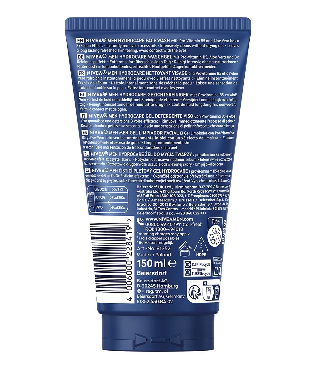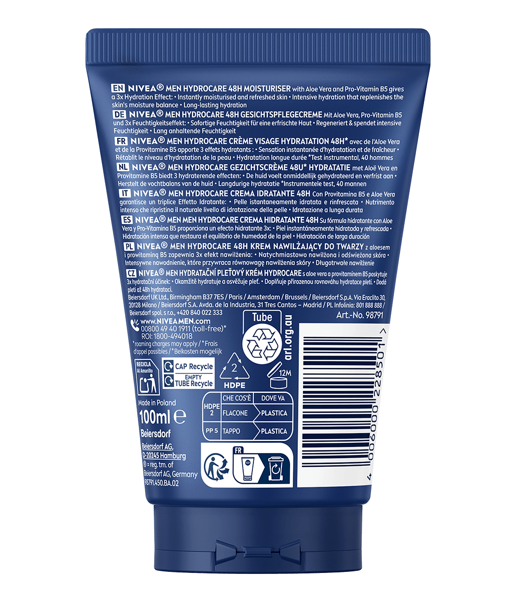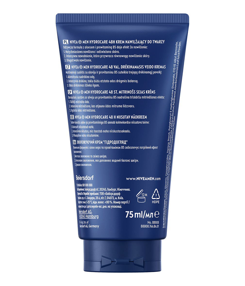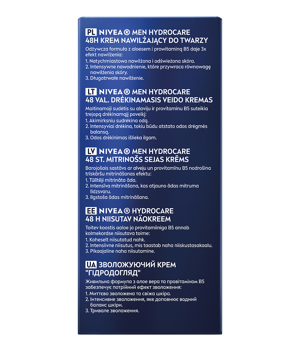 NIVEA MEN HYDROCARE Krem nawilżający do twarzy posiada nietłustą, łagodną formułę z prowitaminą B5 i aloesem, dzięki czemu zapewnia długotrwałe nawilżenie. Krem wzmacnia barierę ochronną skóry, przeciwdziała podrażnieniom oraz koi.