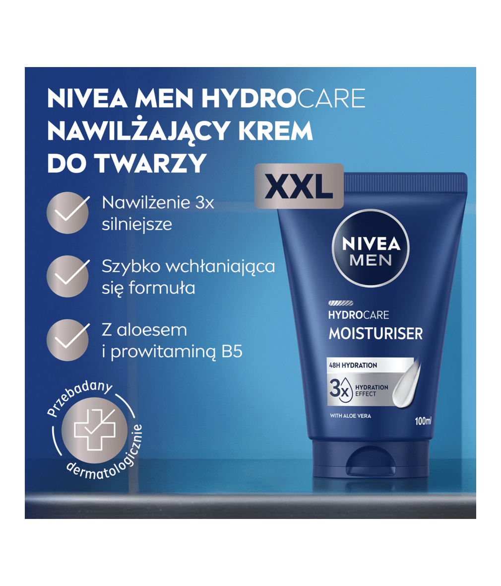 NIVEA MEN HYDROCARE Krem nawilżający do twarzy posiada nietłustą, łagodną formułę z prowitaminą B5 i aloesem, dzięki czemu zapewnia długotrwałe nawilżenie. Krem wzmacnia barierę ochronną skóry, przeciwdziała podrażnieniom oraz koi.