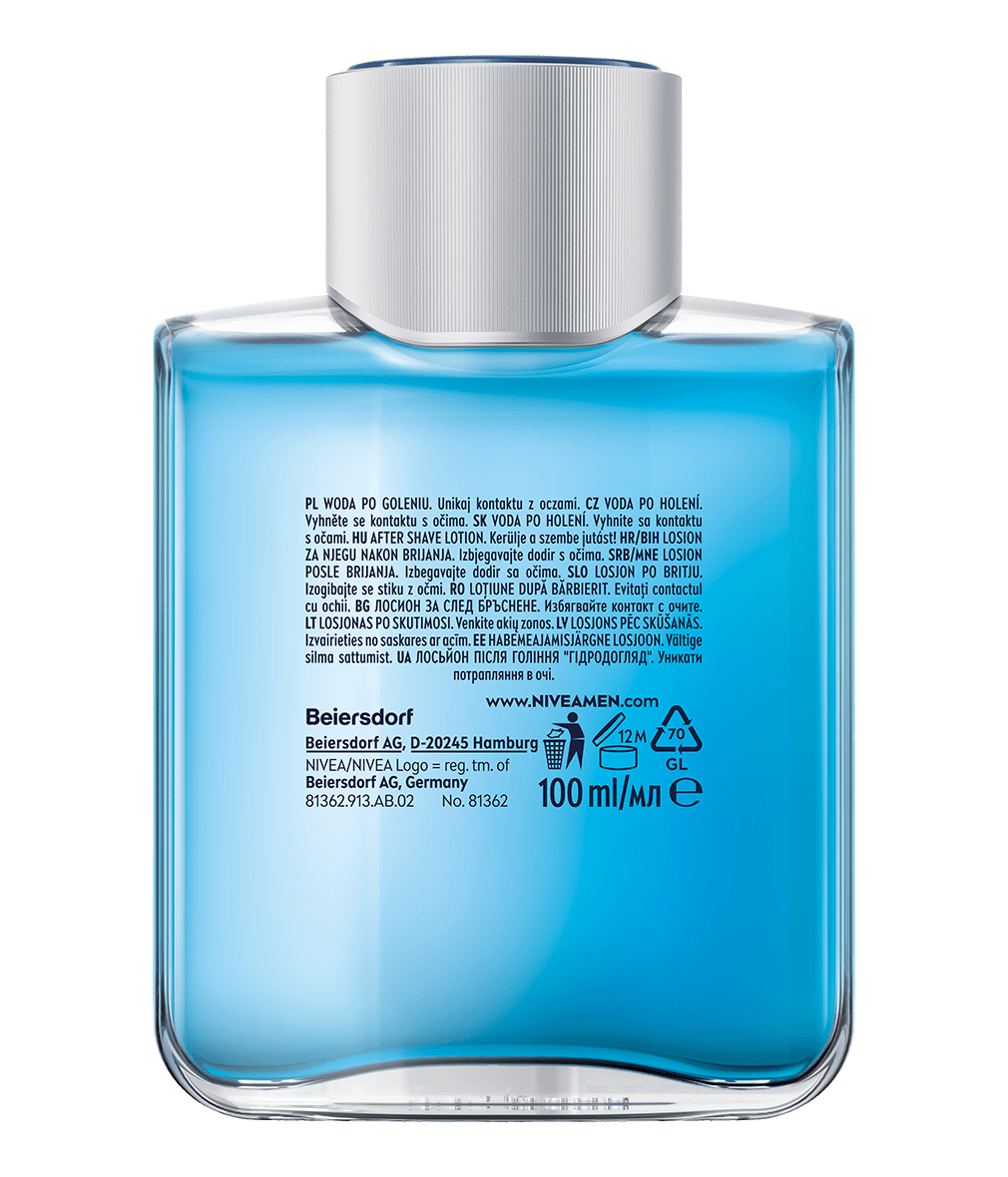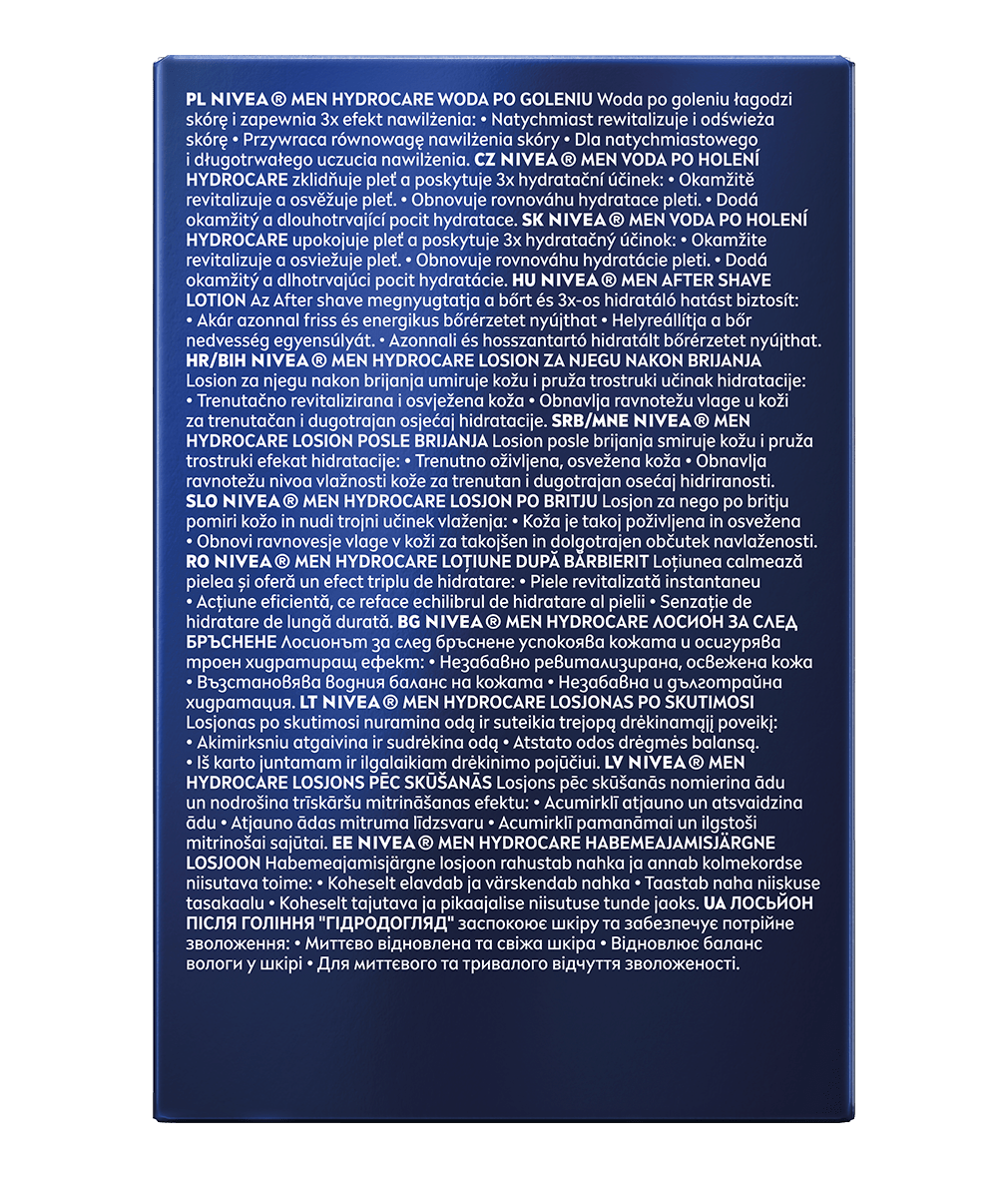 Odświeżająca woda po goleniu NIVEA MEN HydroCare dba o skórę po goleniu oraz chroni ją przed wysuszeniem. Formuła z prowitaminą B5 i aloesem natychmiastowo łagodzi i regeneruje skórę po goleniu. Woda daje 3x efekt nawilżenia.