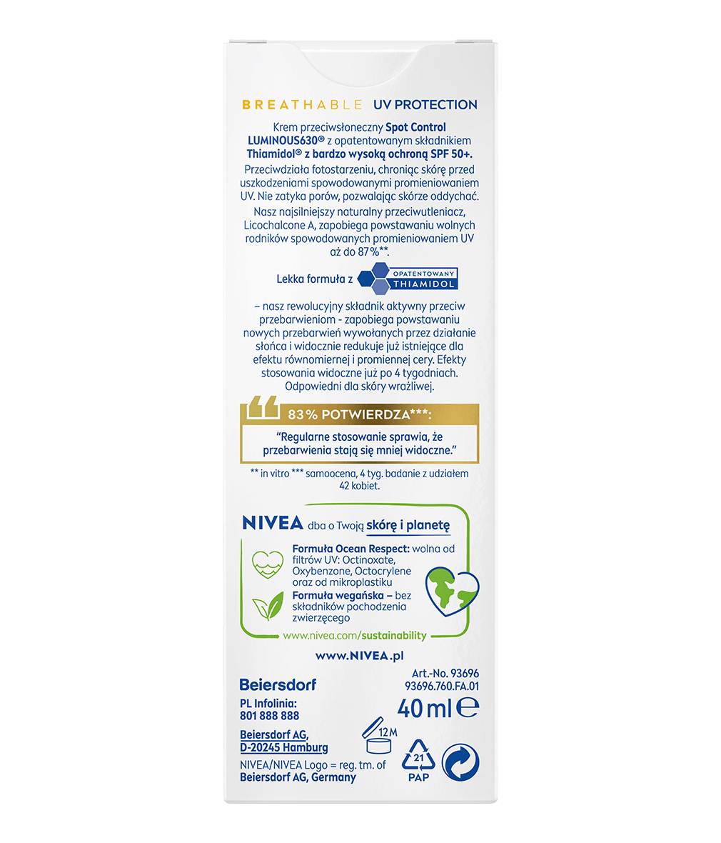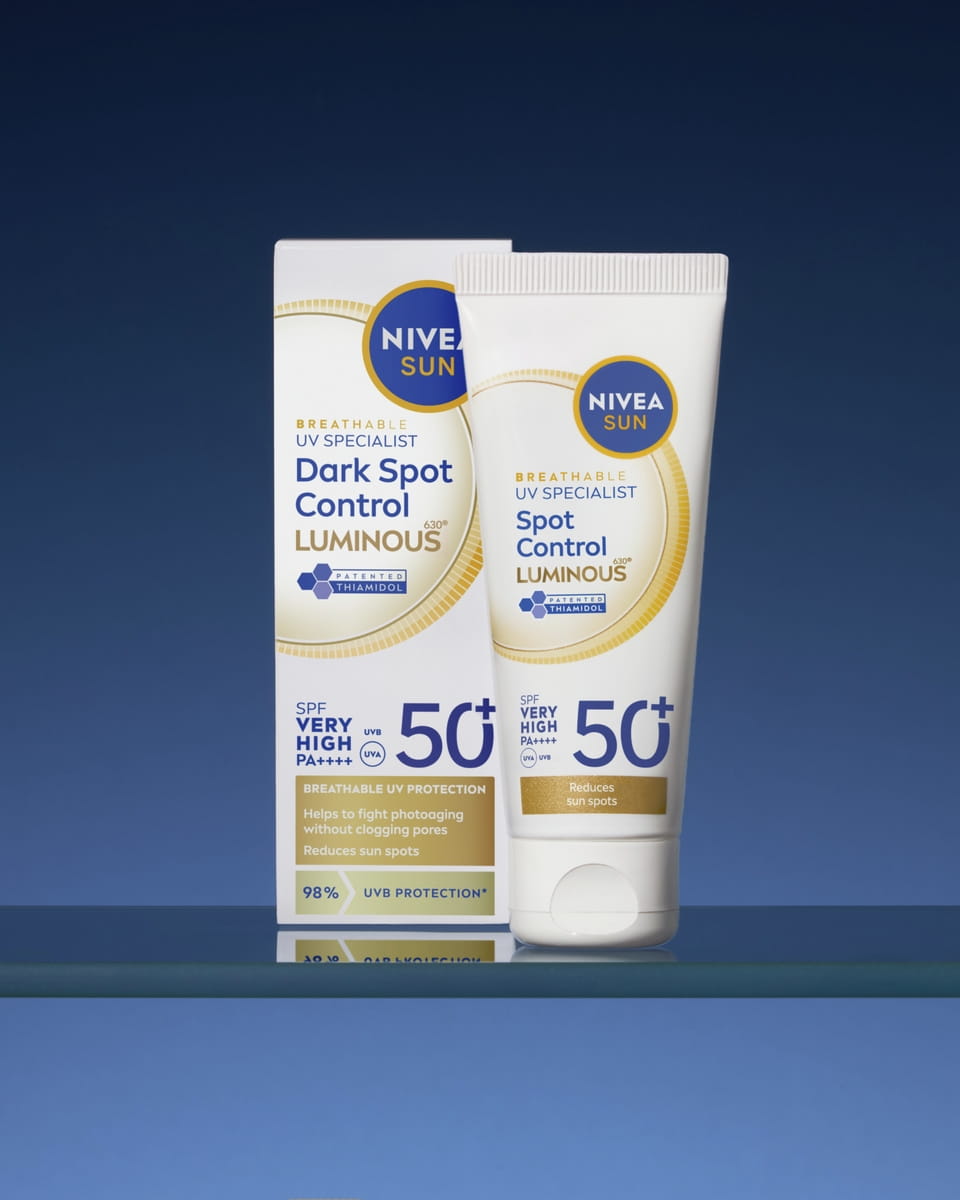 Natychmiastowa ochrona twarzy przed promieniami UV, która zapobiega powstawaniu plam posłonecznych i wyraźnie je redukuje dzięki opatentowanemu składnikowi Luminous630®. Formuła Ocean Respect. NIVEA SUN Spot Control LUMINOUS630® SPF 50+