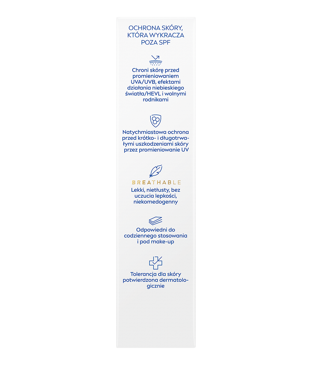 - Wysoka skuteczność- formuła zapewnia natychmiastową ochronę przed krótko- i długoterminowymi uszkodzeniami skóry spowodowanymi przez promieniowanie UVA i UVB oraz przedwczesnym starzeniem się skóry spowodowanym przez słońce