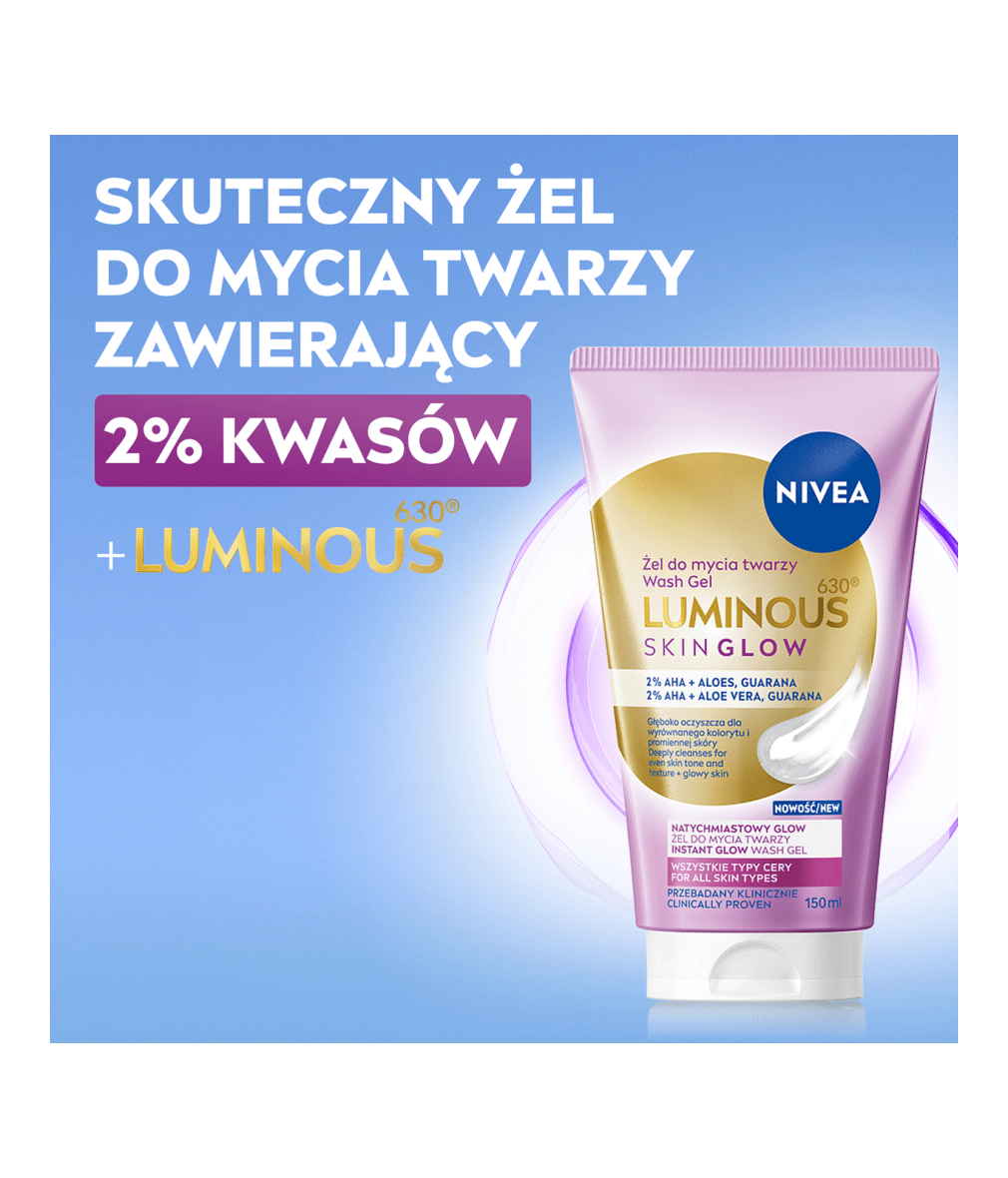 Żel do mycia twarzy NIVEA LUMINOUS630 SKIN GLOW z 2% AHA, aloesem i guaraną dokładnie oczyszcza skórę, usuwając zanieczyszczenia i nadmiar sebum. Działa na 3 wymiary blasku: redukcję błyszczenia, wygładzenie i odnowę skóry dla jednolitej i promiennej cery. Formuła wspiera wyrównanie kolorytu, wygładza strukturę skóry i pozostawia ją promienną z natychmiastowym efektem glow. Podaruj swojej skórze codzienny glow i poczuj jej świeżość! Lekka, delikatna konsystencja sprawia, że żel jest przyjemny w użyciu i odpowiedni do codziennego rytuału pielęgnacyjnego. Produkt jest odpowiedni dla wszystkich typów cery i został przebadany klinicznie. Tolerancja dla skóry została potwierdzona dermatologicznie. NIVEA® - ponad 100 lat doświadczenia w pielęgnacji skóry oraz starannie wyselekcjonowane składniki z zachowaniem najwyższych standardów jakości.