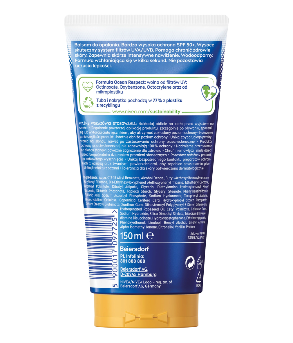 NIVEA Nawilżający balsam do opalania Invisible Finish SPF50+ to natychmiastowa i niezawodna ochrona przed promieniowaniem UVA i UVB. Pomaga chronić zdrowie skóry. Zapewnia skórze intensywne nawilżenie. Wodoodporny.