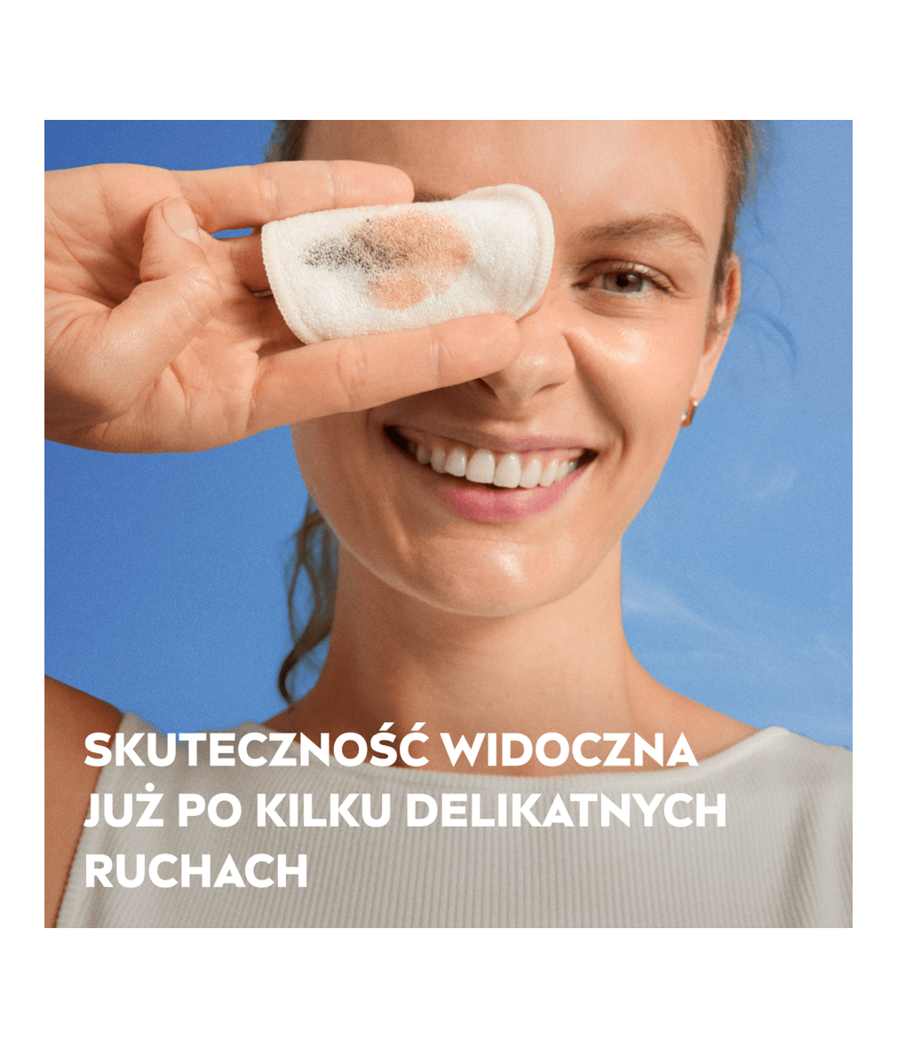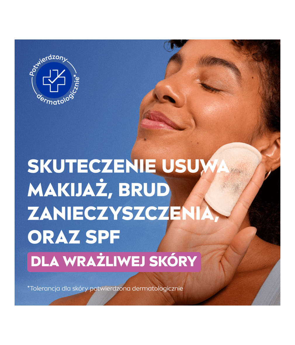 - Skutecznie usuwa makijaż, zanieczyszczenia i brud kilkoma lekkimi pociągnięciami, bez pocierania.