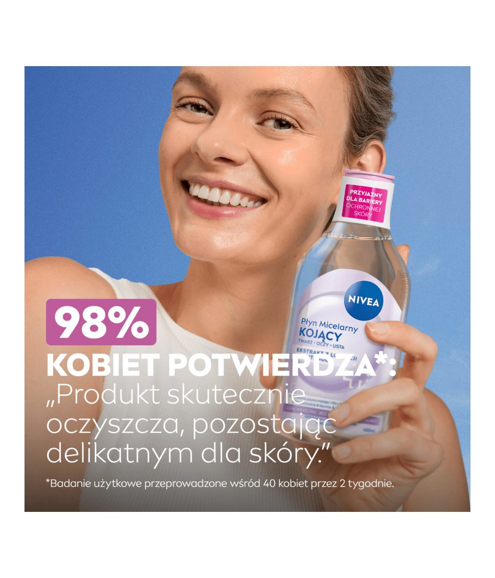 - Płyn micelarny NIVEA bez kompozycji zapachowej. Tolerancja dla skóry i oczu potwierdzona dermatologicznie i okulistycznie