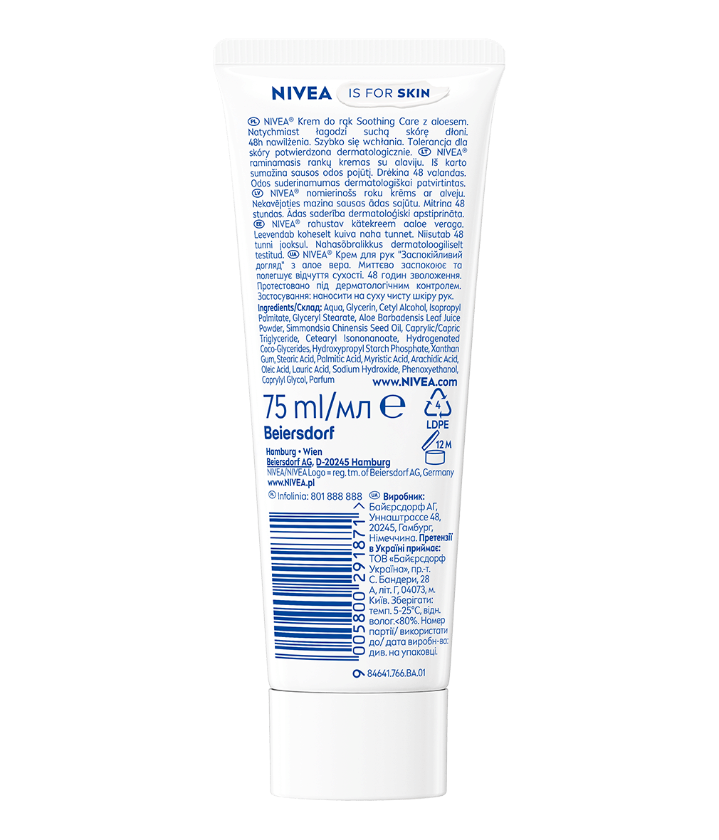 Krem do rąk Soothing Care od NIVEA z aloesem długotrwale łagodzi suchą skórę dłoni i szybko się wchłania. Zapewnia 48 godzinną pielęgnację a dodatkowo odżywia skórę. Produkt przebadany dermatologicznie.