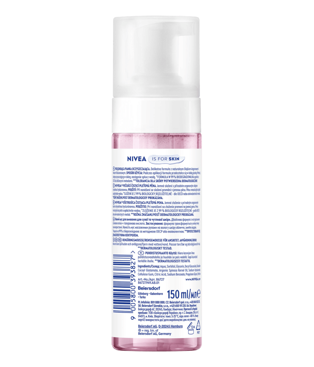 NIVEA Pielęgnująca Pianka do oczyszczania twarzy została wzbogacona naturalnym Olejkiem Arganowym i Kwasem Hialuronowym. Opracowana z myślą o potrzebach skóry suchej i wrażliwej. Nie tylko delikatnie oczyszcza bez wysuszania, ale także łagodnie pielęgnuje skórę. Zapewnia wyjątkowe i przyjemne oczyszczanie dzięki formule miękkiej pianki. Rezultat: Skóra jest delikatnie oczyszczona, gładka i wyglądająca zdrowo. Pianka oczyszczająca do twarzy przeznaczona jest do wszystkich typów cery, również do cery suchej i wrażliwej. Formuła jest biodegradowalna w 99% zgodnie z OECD lub zbliżonymi metodami. Tolerancja dla skóry potwierdzona dermatologicznie. NIVEA® - ponad 100 lat doświadczenia w pielęgnacji skóry oraz starannie wyselekcjonowane składniki z zachowaniem najwyższych standardów jakości.