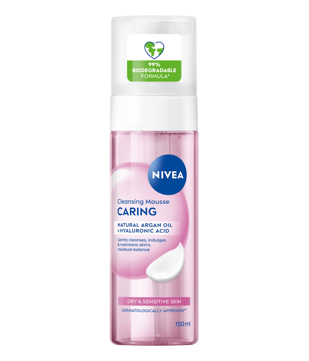 NIVEA® Pielęgnująca Pianka Oczyszczająca z naturalnym Olejkiem Arganowym i Kwasem Hialuronowym. Delikatnie i skutecznie oczyszcza skórę twarzy dodatkowo ją pielęgnując. Dla wrażliwej i suchej skóry twarzy.