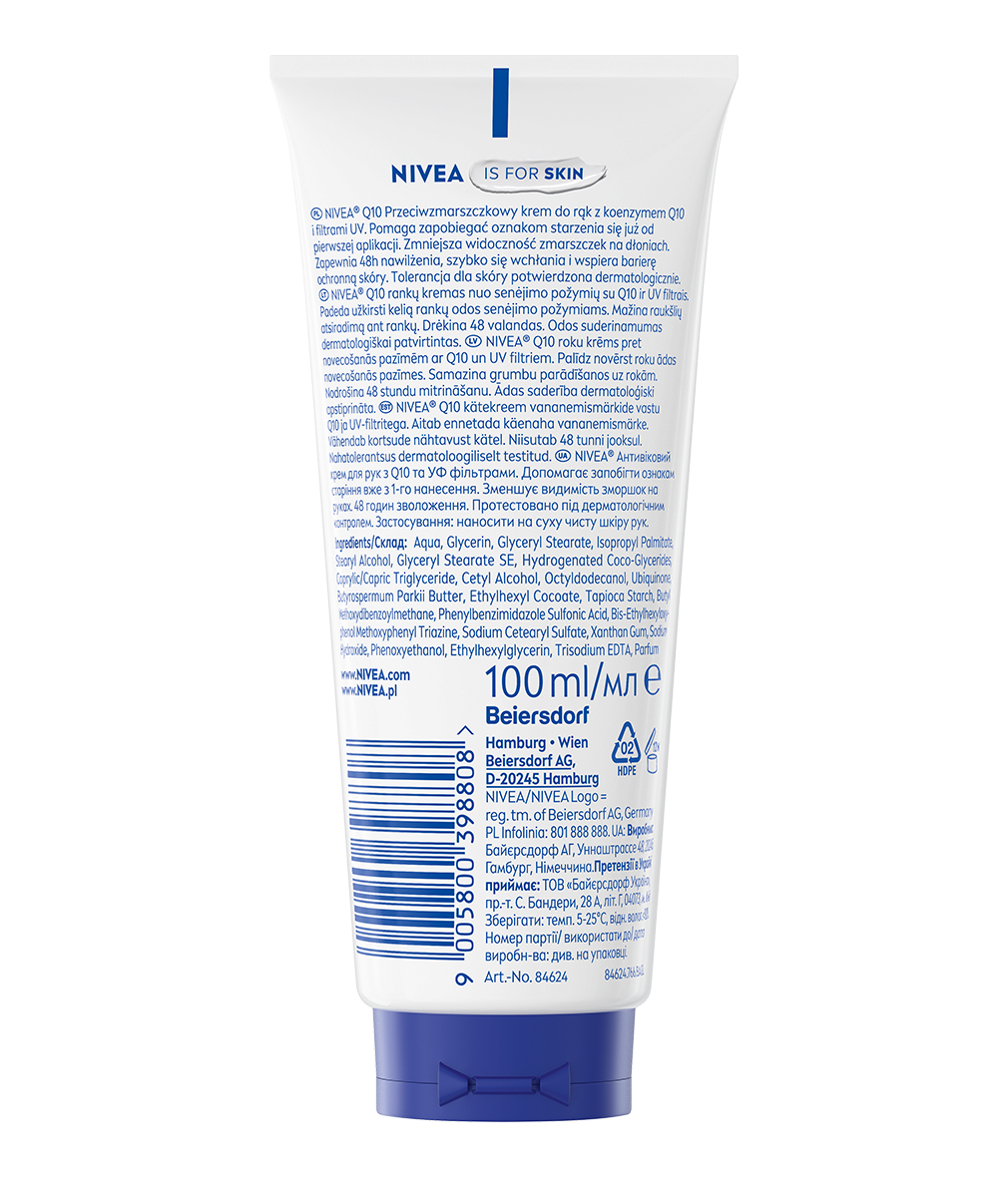 Przeciwzmarszczkowy krem do rąk Q10 od NIVEA pomaga redukować widoczność zmarszczek, wygładza i wyrównuje teksturę skóry. Formuła z Koenzymem Q10 i filtrami UV. Zapewnia 48-godzinne nawilżenie skóry dłoni.