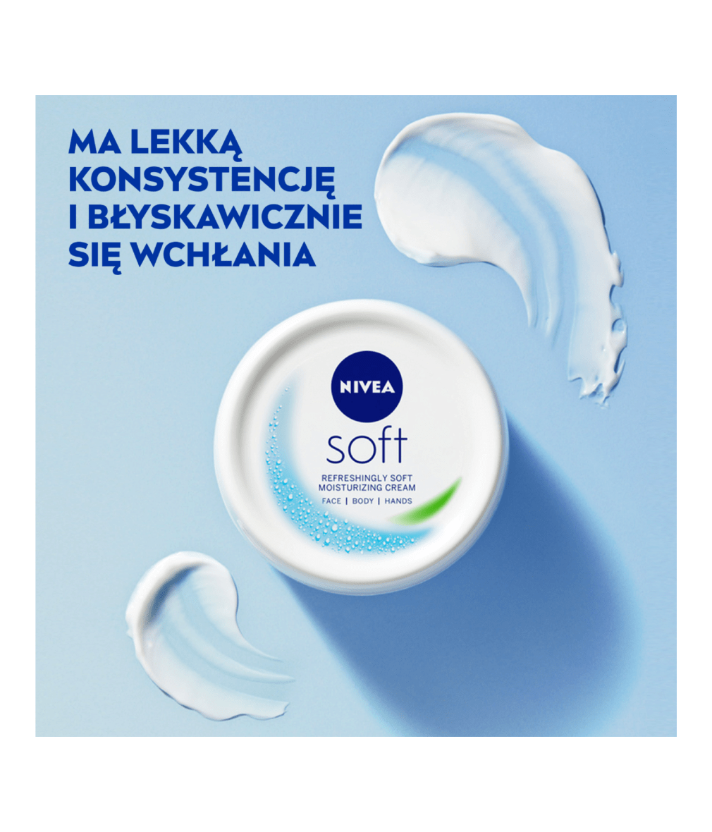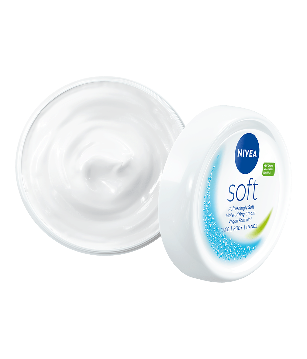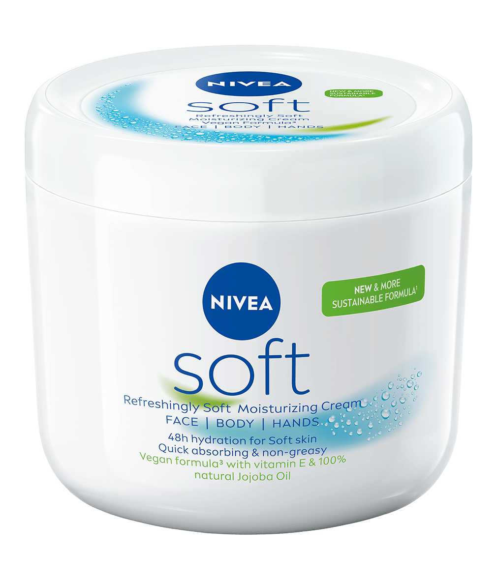 Intensywnie nawilżający i wysoce skuteczny krem NIVEA® Soft do codziennego użytku. Dzięki lekkiej formule zawierającej Witaminę E oraz 100% naturalny Olejek Jojoba szybko się wchłania i pozostawia skórę wyraźnie miękką i odświeżoną.