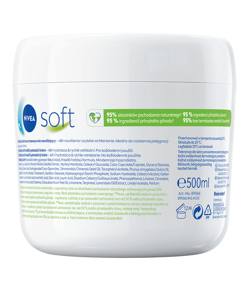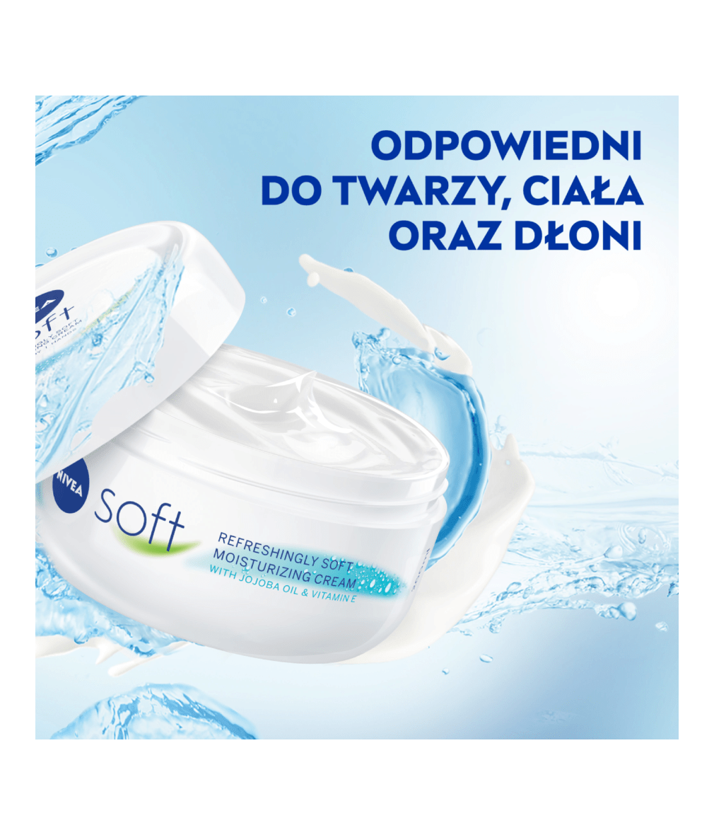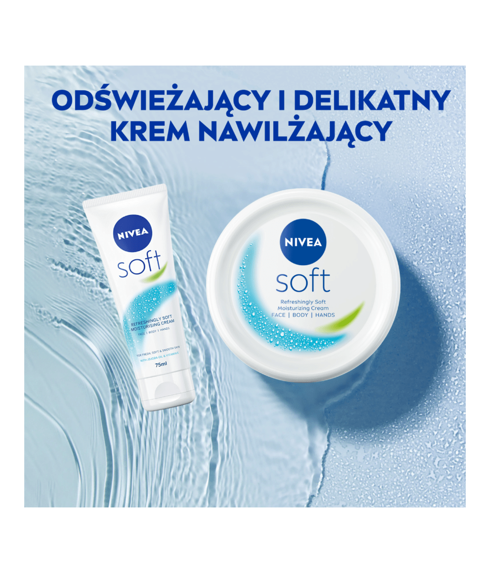 Intensywnie nawilżający i wysoce skuteczny krem NIVEA® Soft do codziennego użytku. Dzięki lekkiej formule zawierającej Witaminę E oraz 100% naturalny Olejek Jojoba szybko się wchłania i pozostawia skórę wyraźnie miękką i odświeżoną.