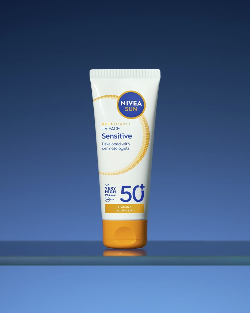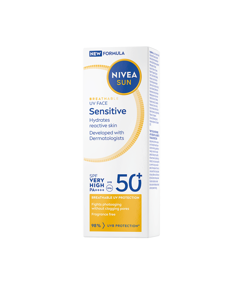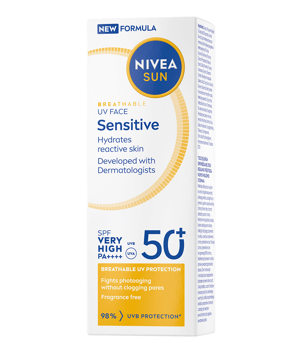 NIVEA SUN Breathable UV Face Sensitive SPF 50+ przeciwdziała fotostarzeniu skóry, nie zatyka porów. Nawilża skórę wrażliwą i nie zawiera substancji zapachowych. Lekka i nawilżająca konsystencja sprawia, że krem jest idealny do codziennego stosowania.