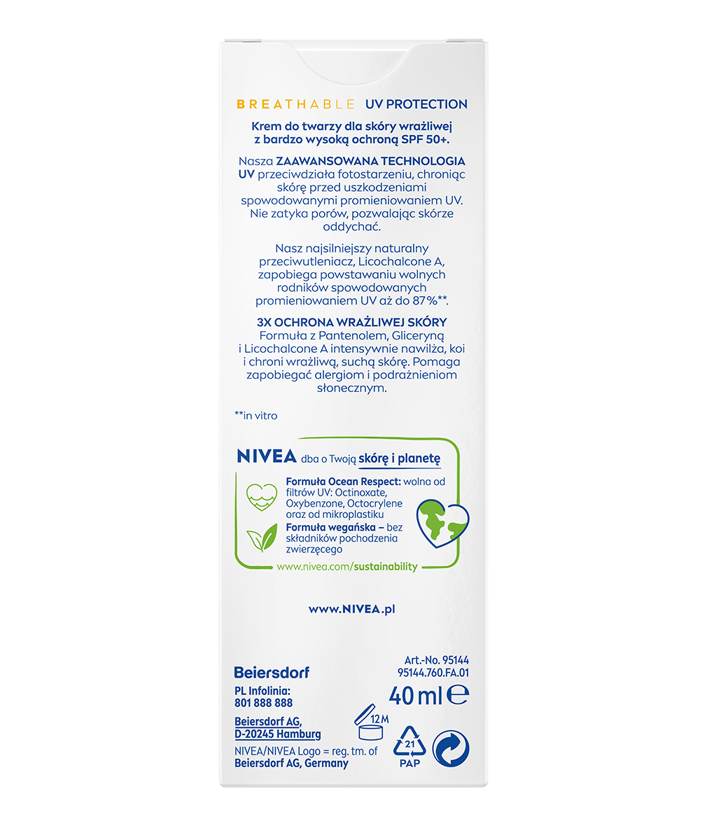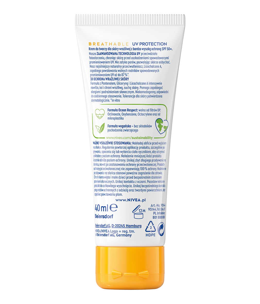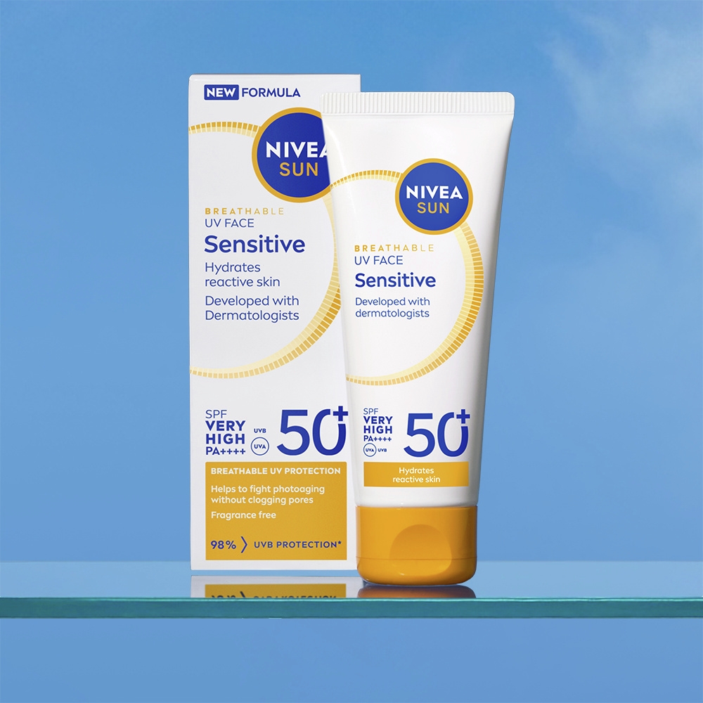 NIVEA SUN Breathable UV Face Sensitive SPF 50+ przeciwdziała fotostarzeniu skóry, nie zatyka porów. Nawilża skórę wrażliwą i nie zawiera substancji zapachowych. Lekka i nawilżająca konsystencja sprawia, że krem jest idealny do codziennego stosowania.