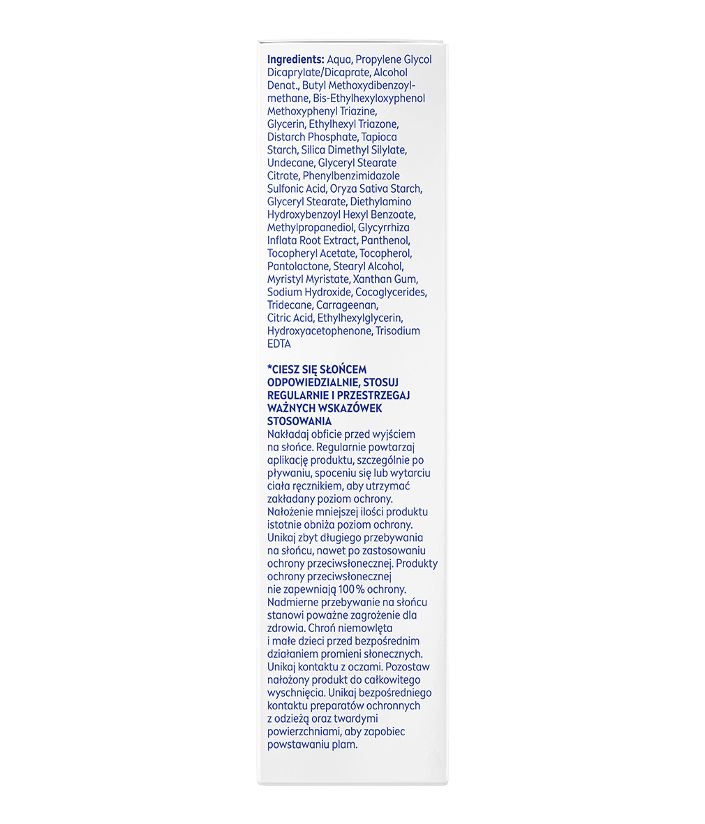 Unikaj zbyt długiego przebywania na słońcu, nawet po zastosowaniu ochrony przeciwsłonecznej. Produkty ochrony przeciwsłonecznej nie zapewniają 100 % ochrony. Nadmierne przebywanie na słońcu stanowi poważne zagrożenie dla zdrowia. Chroń niemowlęta i małe dzieci przed bezpośrednim działaniem promieni słonecznych. Unikaj kontaktu z oczami. Pozostaw nałożony produkt do całkowitego wyschnięcia. Unikaj bezpośredniego kontaktu preparatów ochronnych z odzieżą oraz twardymi powierzchniami, aby zapobiec powstawaniu plam.
