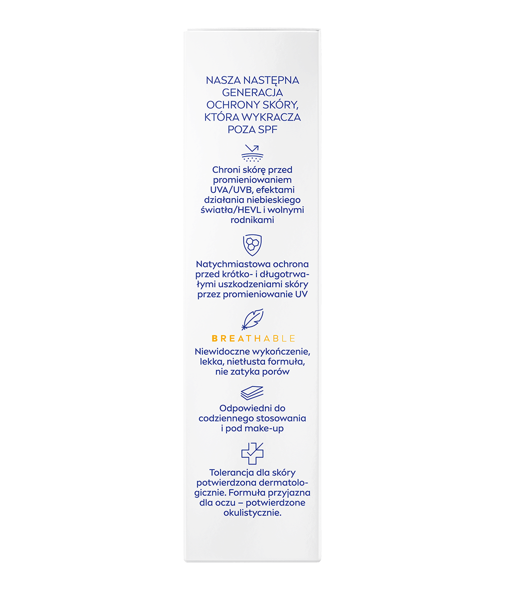 - Chroni skórę przed promieniowaniem UVA/UVB, efektami działania niebieskiego światła/HEVL i wolnymi rodnikami