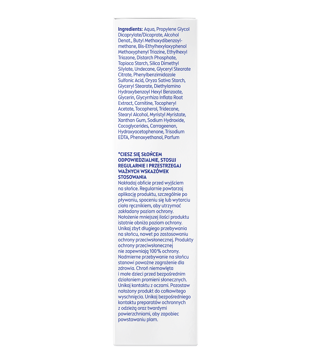 Zawiera: Aqua, Alcohol Denat, Butyl Methoxydibenzoylmethane, Bis-Ethylhexyloxyphenol Methoxyphenyl Triazine, Ethylhexyl Triazone, Distarch Phosphate, Tapioca Starch, Silica Dimethyl Silylate, Glyceryl Stearate Citrate, Phenylbenzimidazole Sulfonic Acid, Oryza Sativa Starch, Glyceryl Stearate, Diethylamino Hydroxybenzoyl Hexyl Benzoate, Glycerin, Glycyrrhiza Inflata Root Extract, Carnitine, Tocopheryl Acetate, Tocopherol, Stearyl Alcohol, Myristyl Myristate, Xanthan Gum, Sodium Hydroxide, Cocoglycerides, Carrageenan, Hydroxyacetophenone, Trisodium EDTA, Phenoxyethanol, Parfum