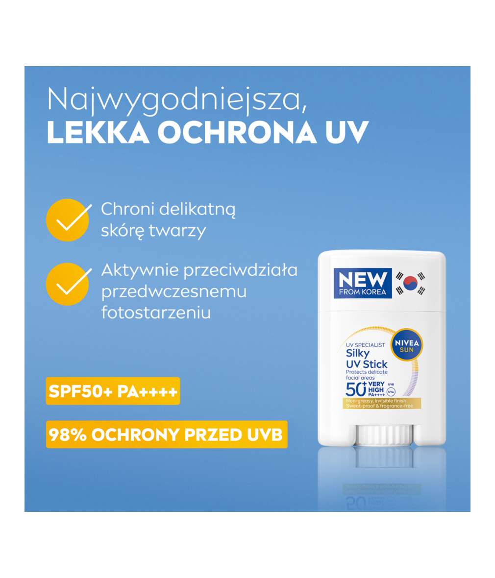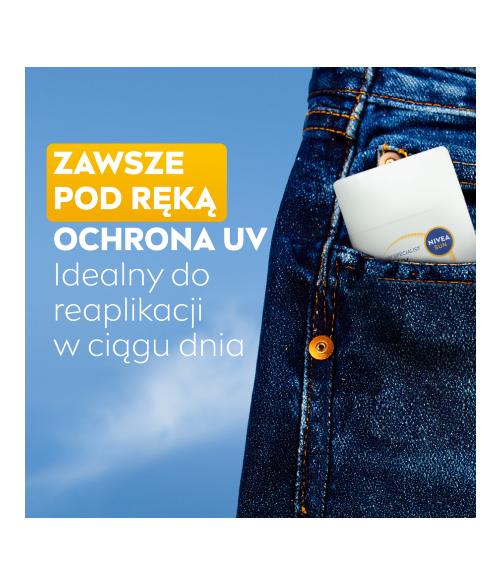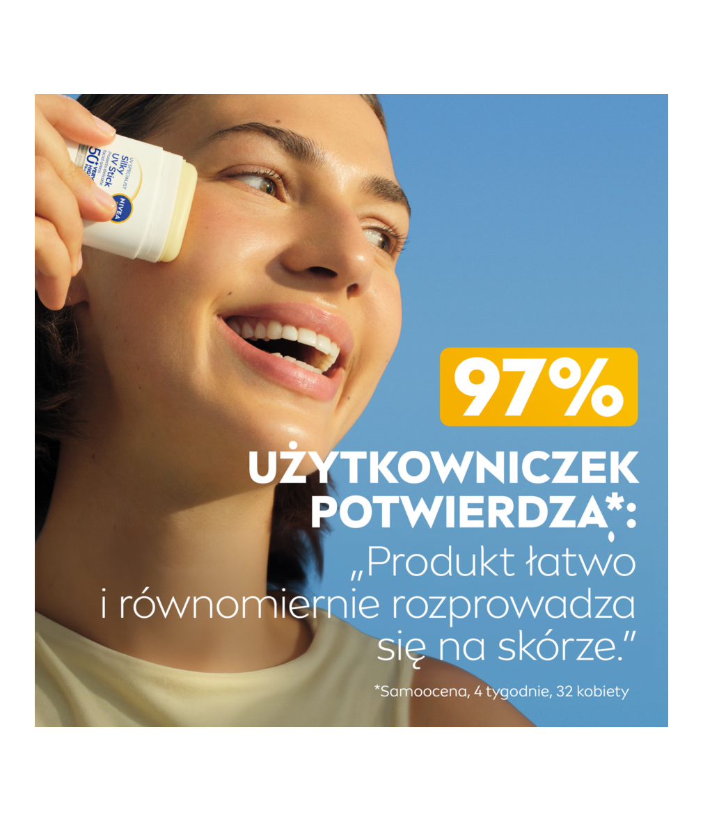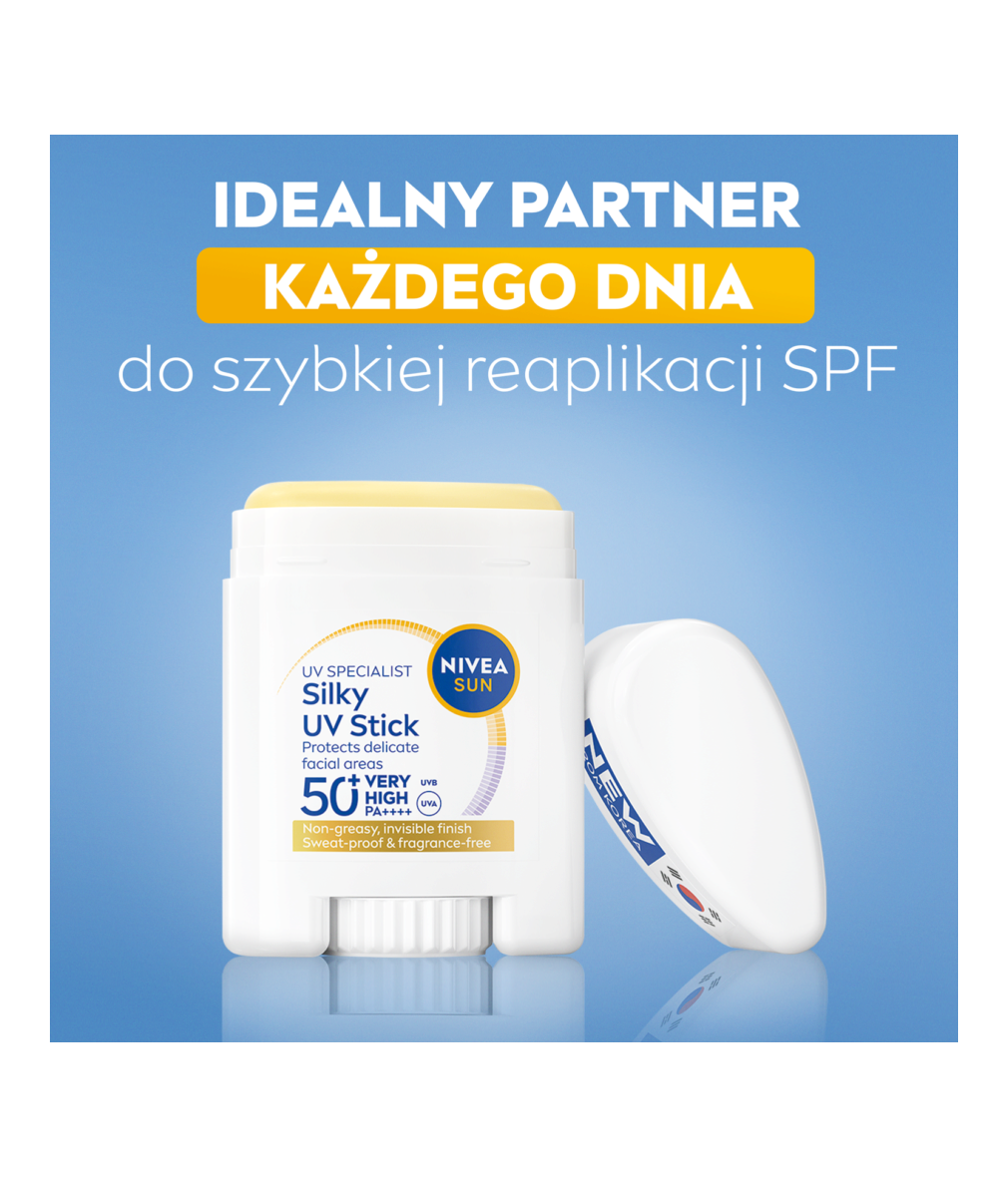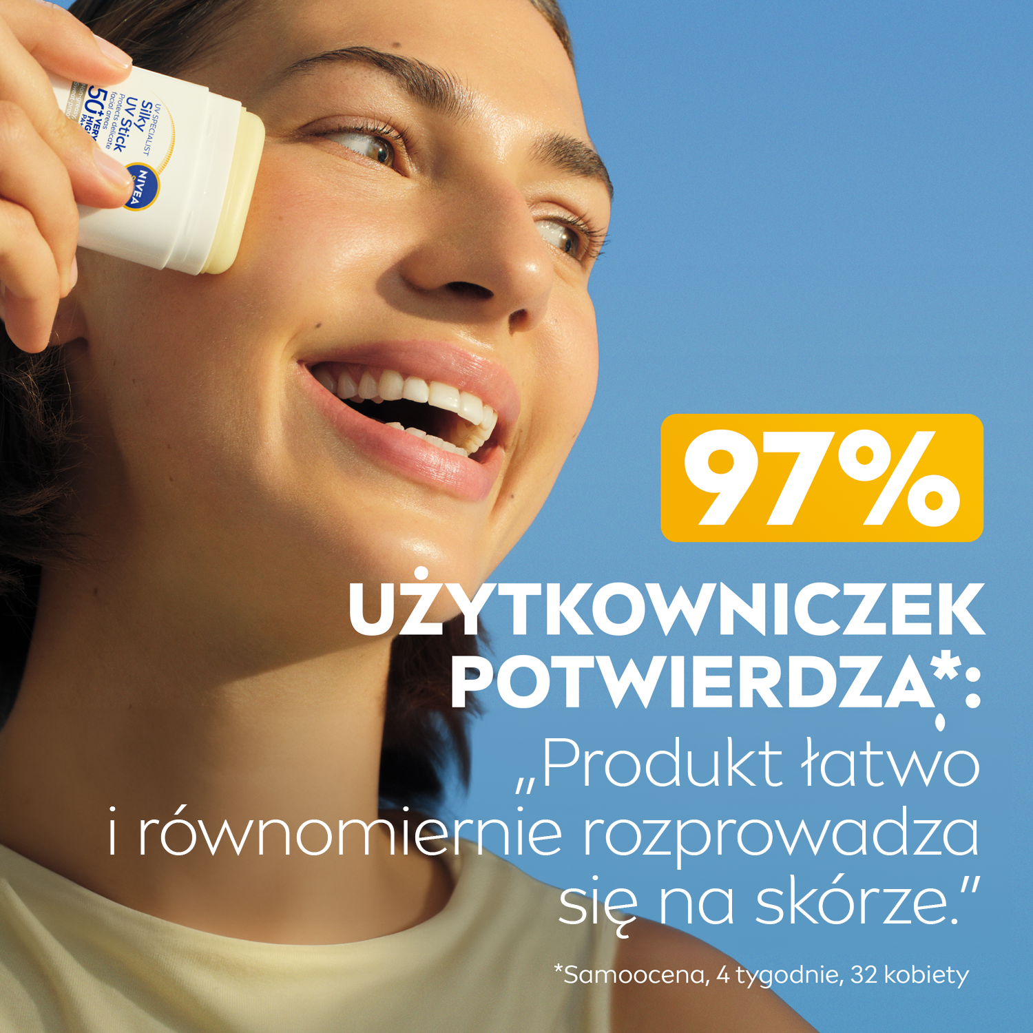 NIVEA SUN Breathable UV Specialist Silky UV Stick SPF 50+ przeciwdziała fotostarzeniu skóry, nie zatyka porów. Chroni delikatną skórę dzięki niewidocznemu, odpornemu na pot i bezzapachowemu wykończeniu. Idealny do ponownej aplikacji w ciągu dnia.