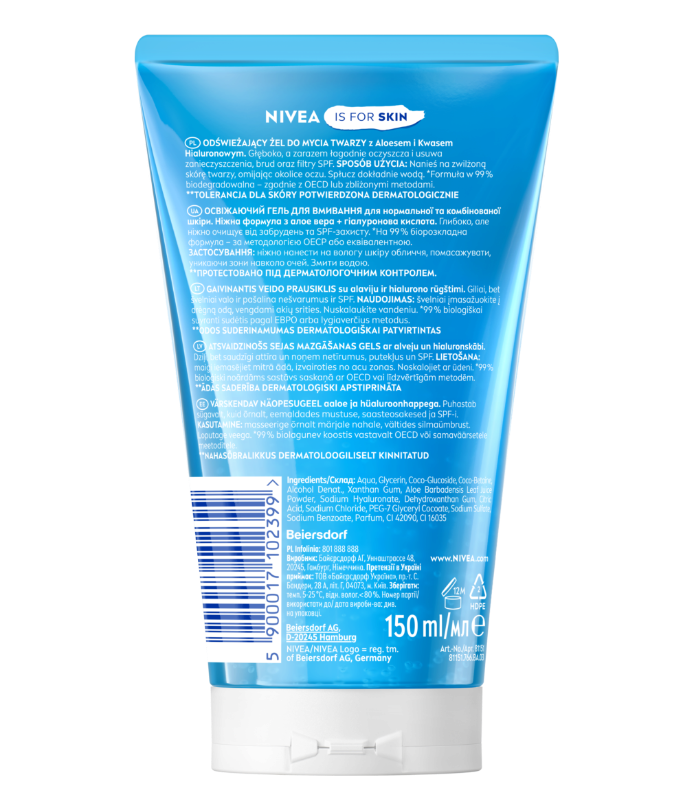 ODŚWIEŻAJĄCY ŻEL DO MYCIA TWARZY z Aloesem i Kwasem Hialuronowym. Głęboko, a zarazem łagodnie oczyszcza i usuwa zanieczyszczenia, brud oraz filtry SPF. SPOSÓB UŻYCIA: Nanieś na zwilżoną skórę twarzy, omijając okolice oczu. Spłucz dokładnie wodą.