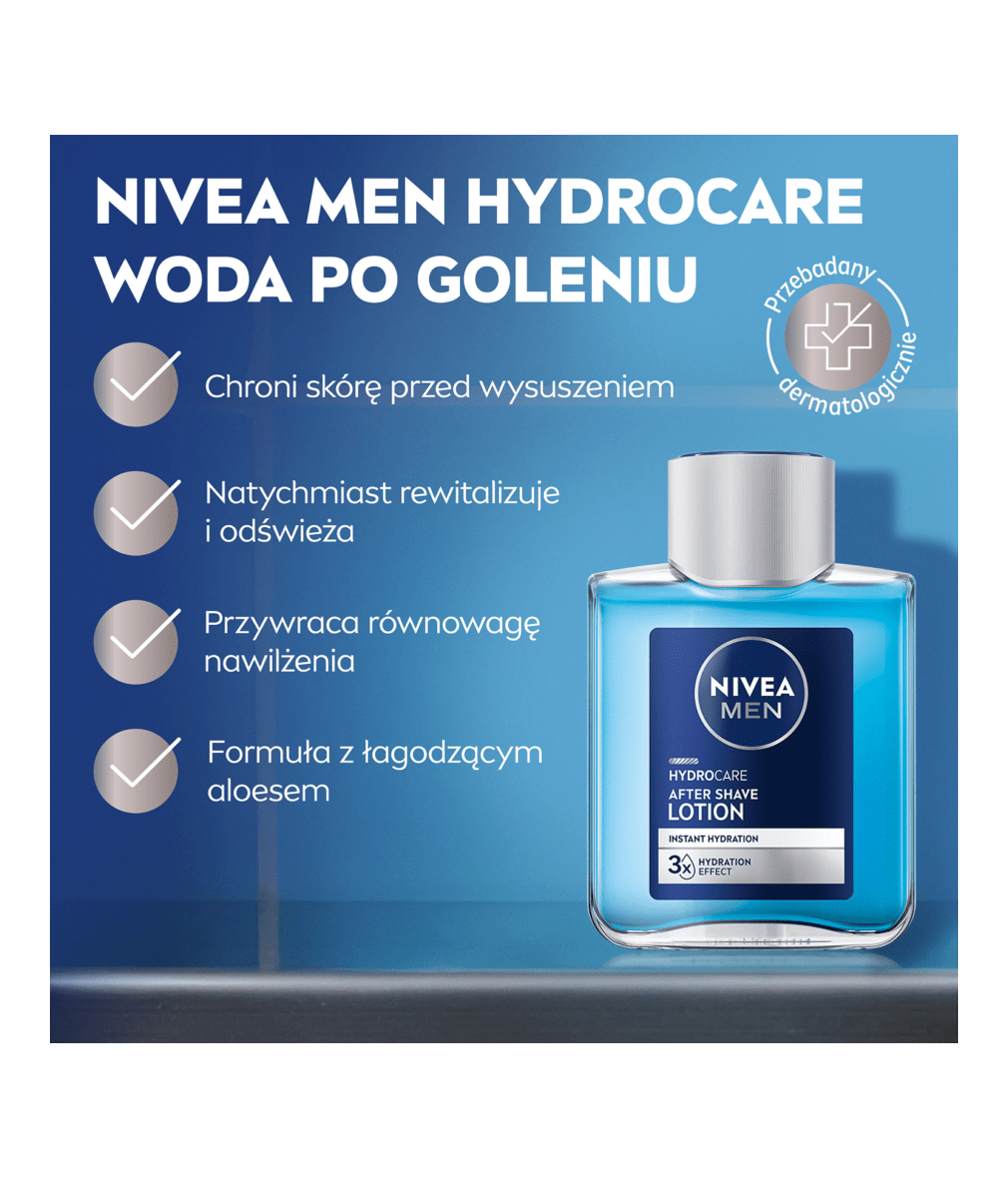 Odświeżająca woda po goleniu NIVEA MEN Hydrocare dba o skórę po goleniu oraz chroni ją przed wysuszeniem. Formuła z prowitaminą B5 i aloesem natychmiastowo łagodzi i regeneruje skórę po goleniu. Zapewnia 3x efekt nawilżenia.