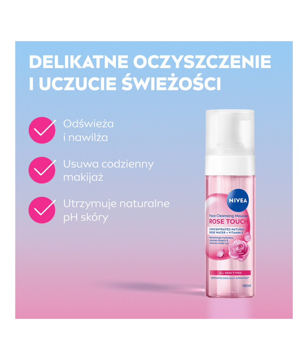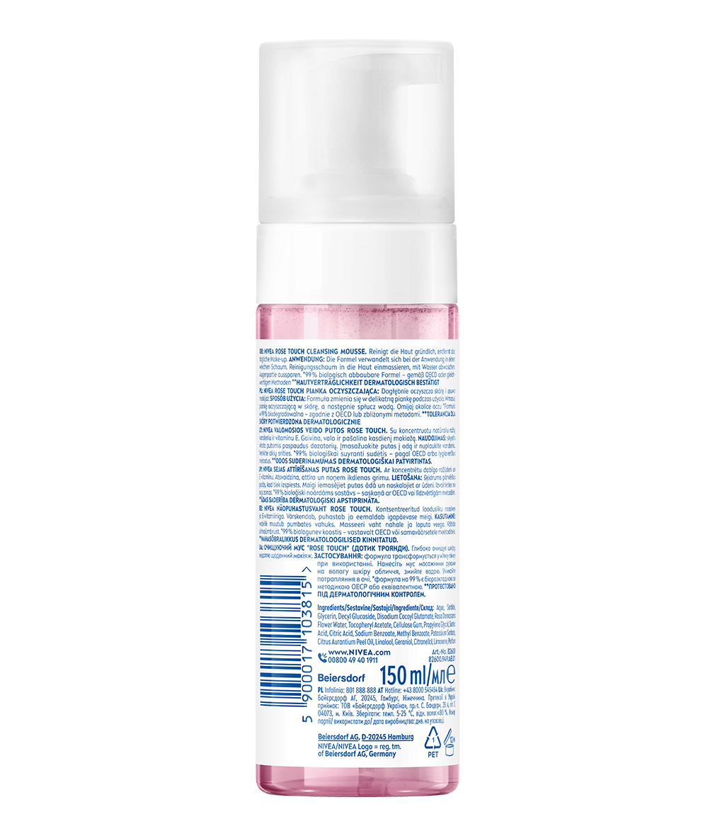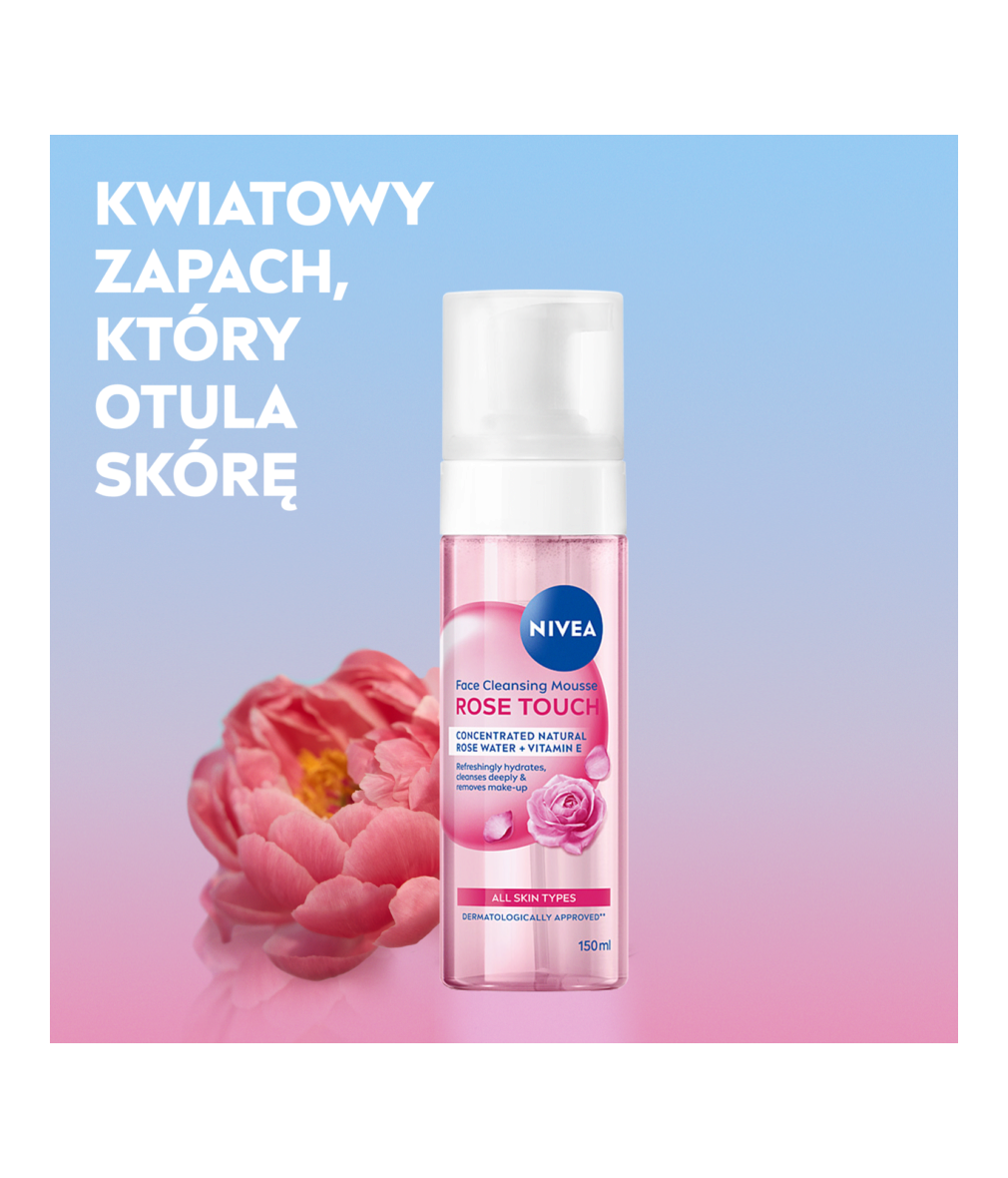 NIVEA ROSE TOUCH PIANKA OCZYSZCZAJĄCA z formułą wzbogaconą organiczną wodą różaną oraz technologią micelarną dba o odpowiedni poziom nawilżenia, jednocześnie dogłębnie oczyszczając skórę i przygotowując ją do kolejnego etapu pielęgnacji.