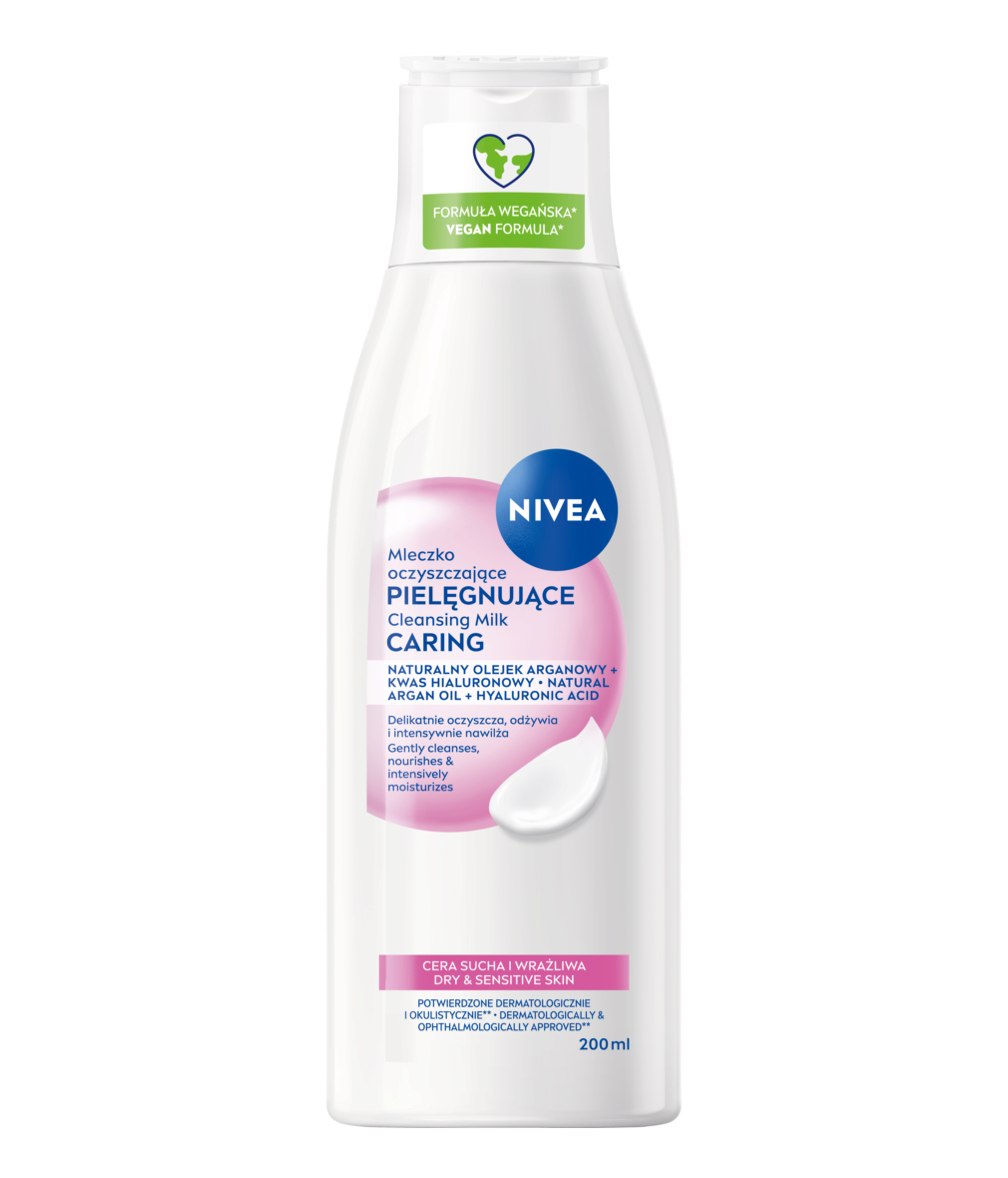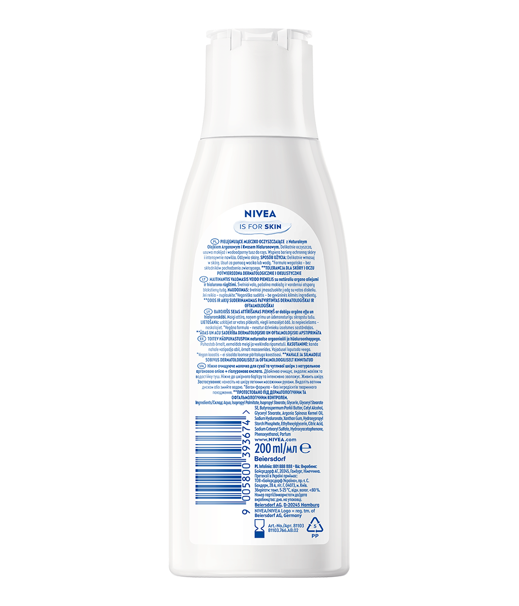 PIELĘGNUJĄCE MLECZKO OCZYSZCZAJĄCE z Naturalnym Olejkiem Arganowym i Kwasem Hialuronowym. Delikatnie oczyszcza, usuwa makijaż i wodoodporny tusz do rzęs. Wspiera barierę ochronną skóry i intensywnie nawilża. Odżywia skórę.