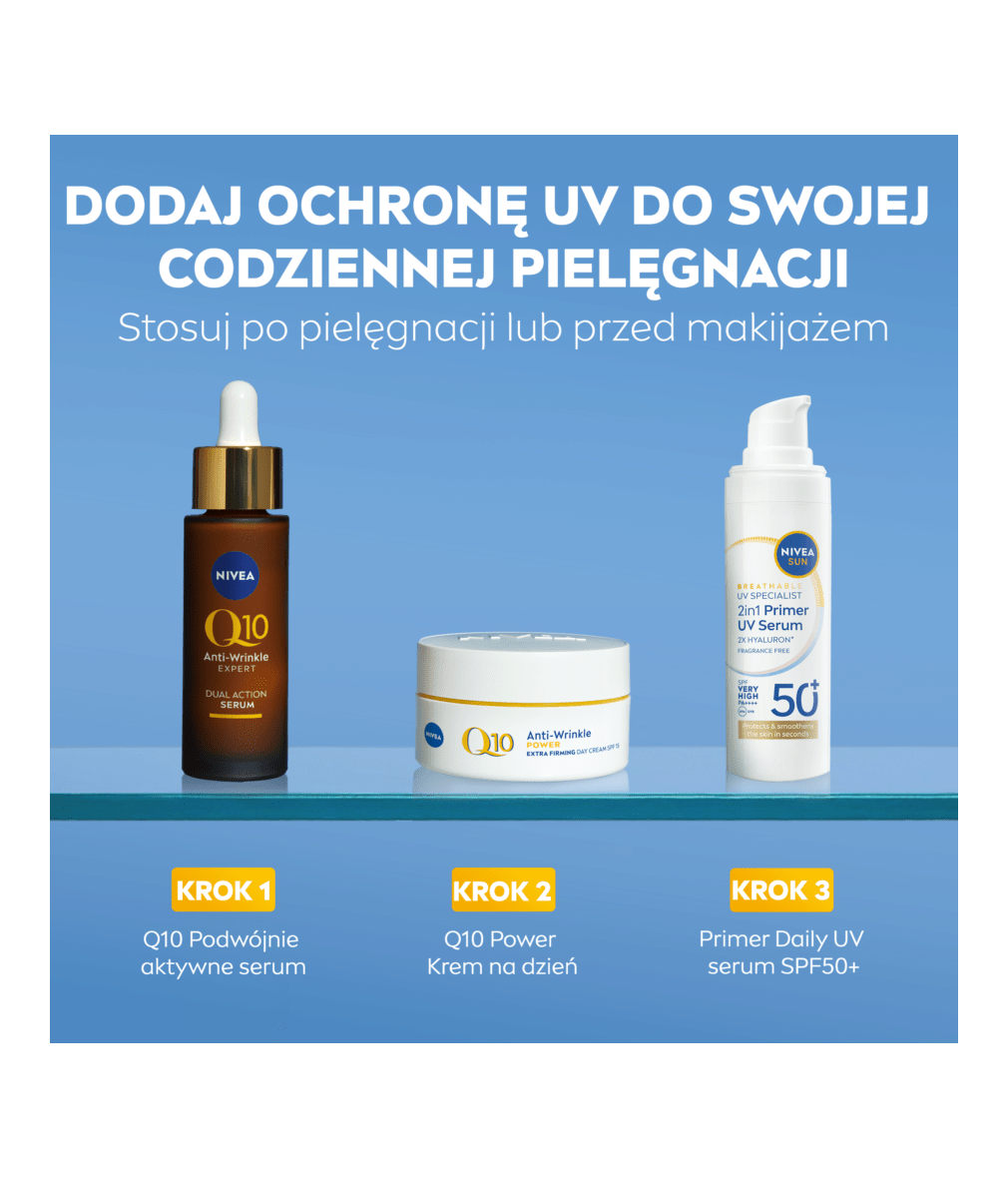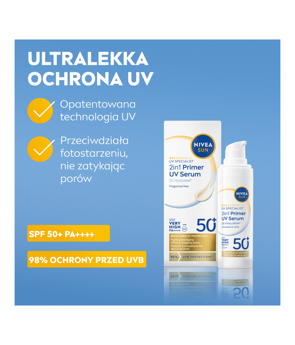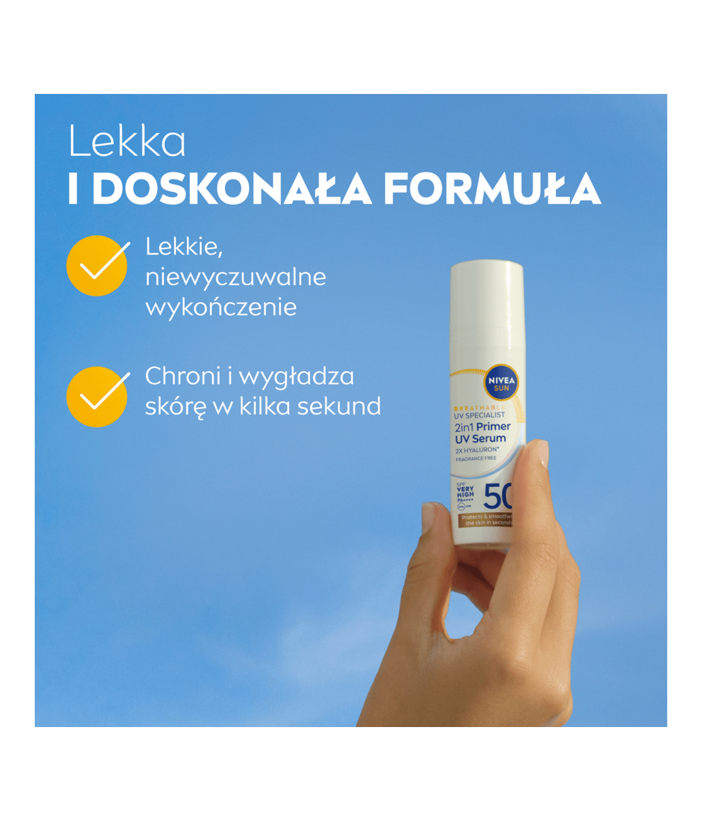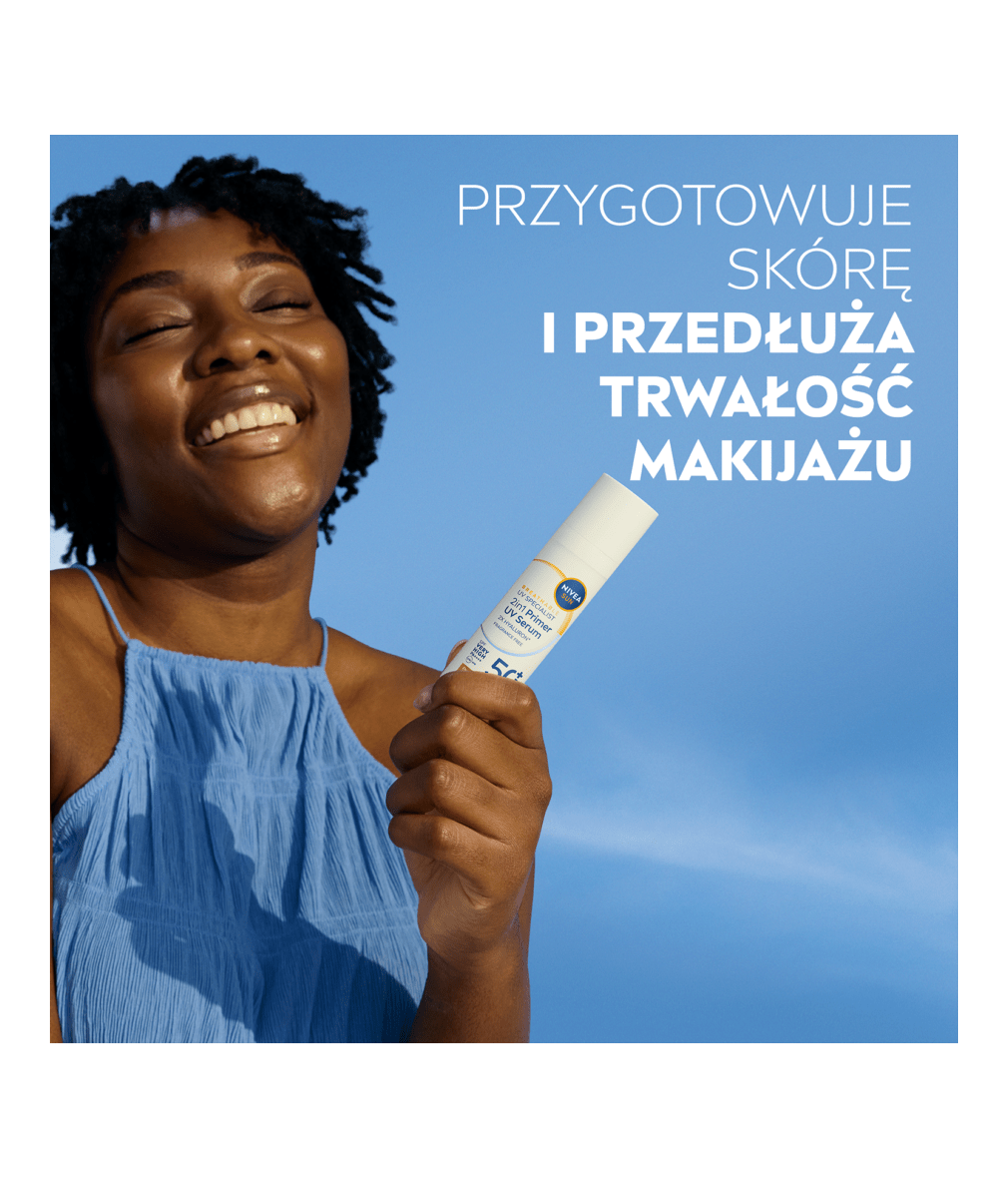 Innowacyjna, lekka formuła przeciwsłoneczna NIVEA Primer Daily UV Serum 2w1 z bardzo wysoką ochroną SPF50+. Chroni zdrową skórę przed promieniami UVA/UVB. Idealna do codziennego stosowania jako baza pod makijaż. Niewidoczne wykończenie, niezależnie od karnacji skóry.