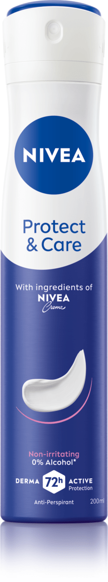 Niezawodna 72 godzinna ochrona antyperspirantu NIVEA Protect & Care i pielęgnacja skóry. Zapewnia uczucie gładkiej skóry. Zawiera cenne składniki i unikalny zapach Kremu NIVEA. Nie zawiera alkoholu etylowego.