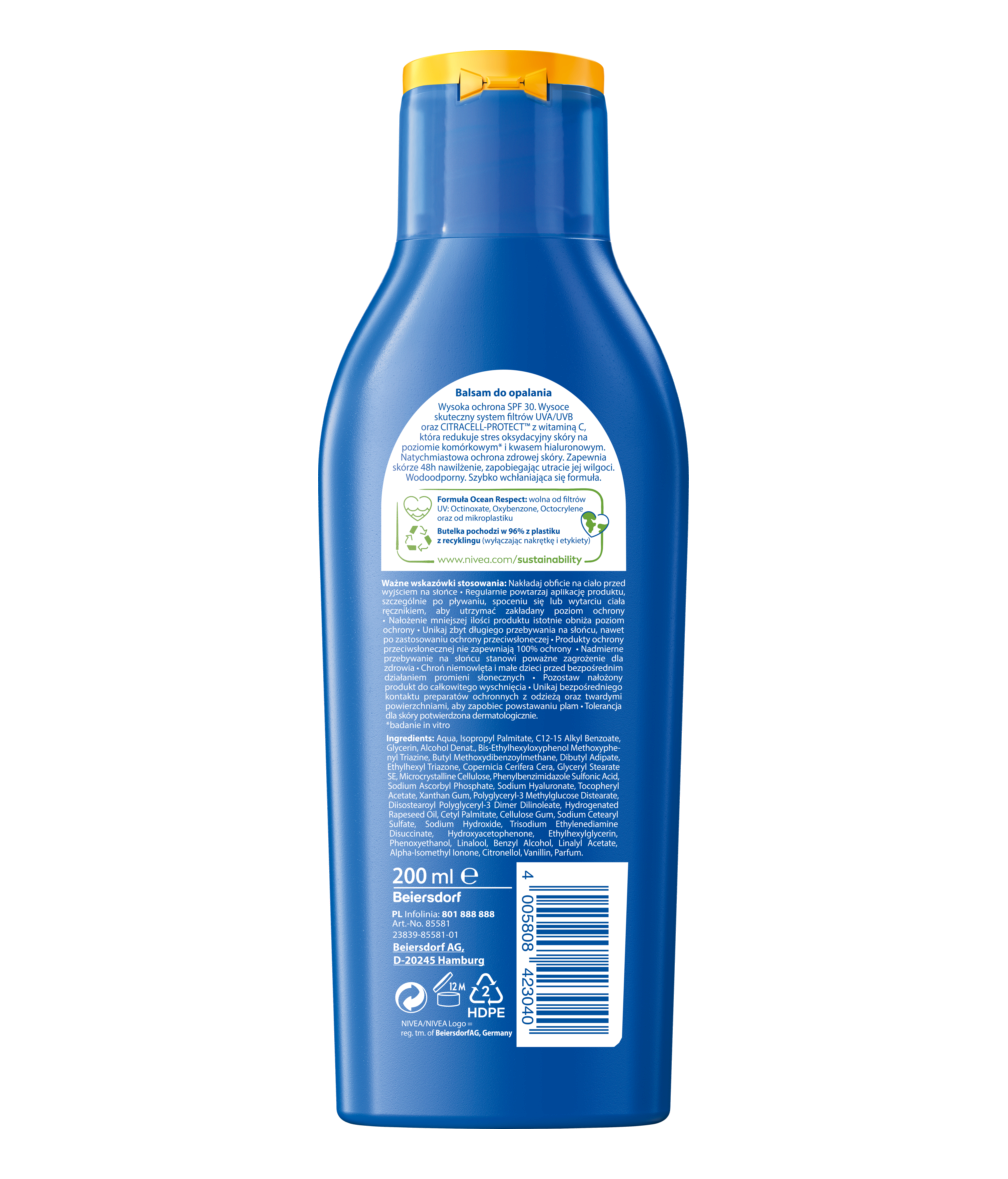 Natychmiastowa ochrona przed promieniowaniem UV, 48h nawilżenia z formułą Ocean Respect, która chroni zdrową skórę od wewnątrz i na zewnątrz. NIVEA SUN Protect& Moisture nawilżający balsam do opalania SPF 30