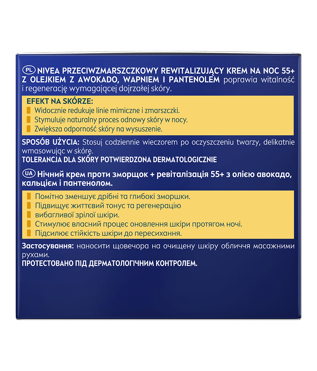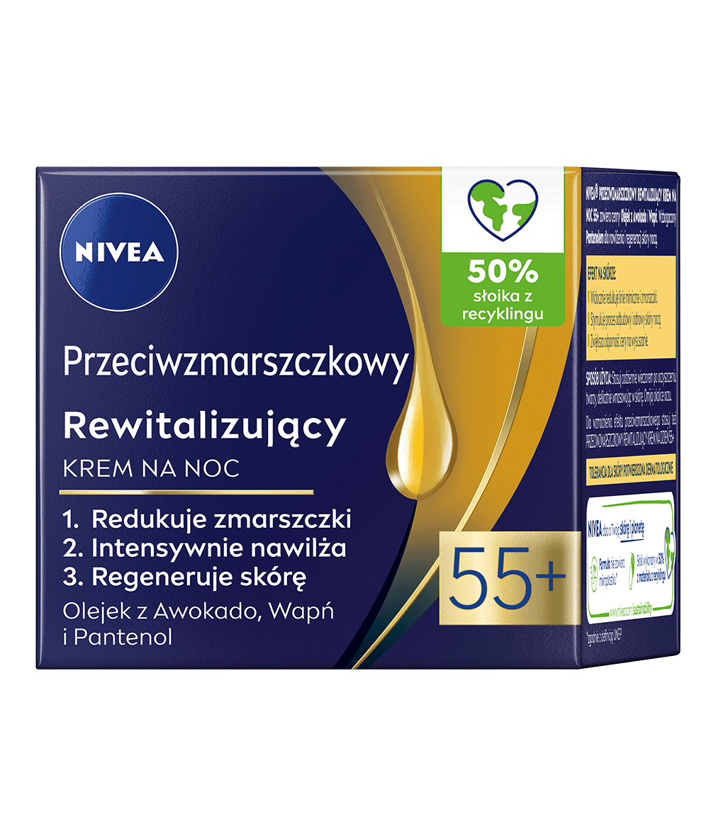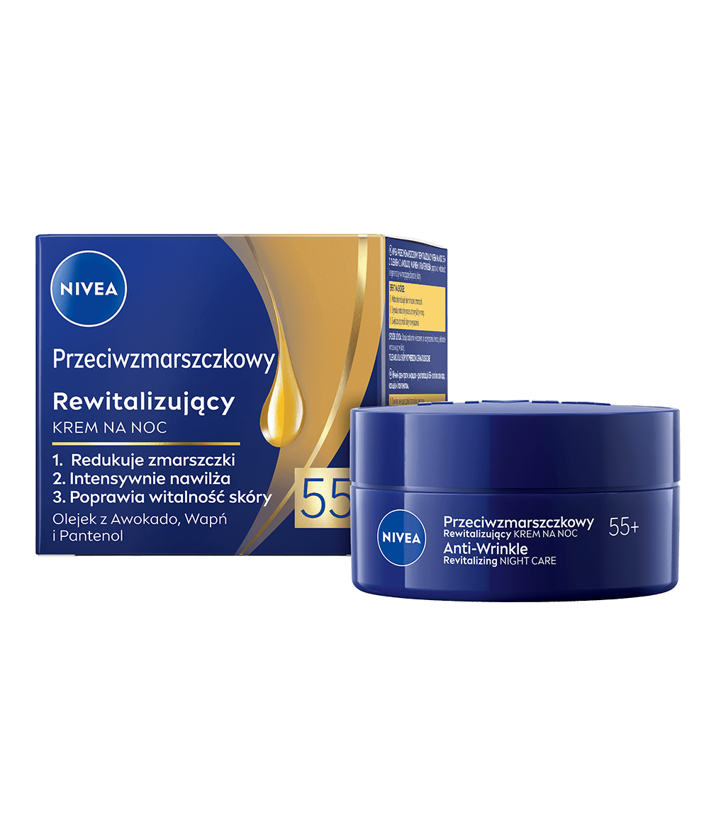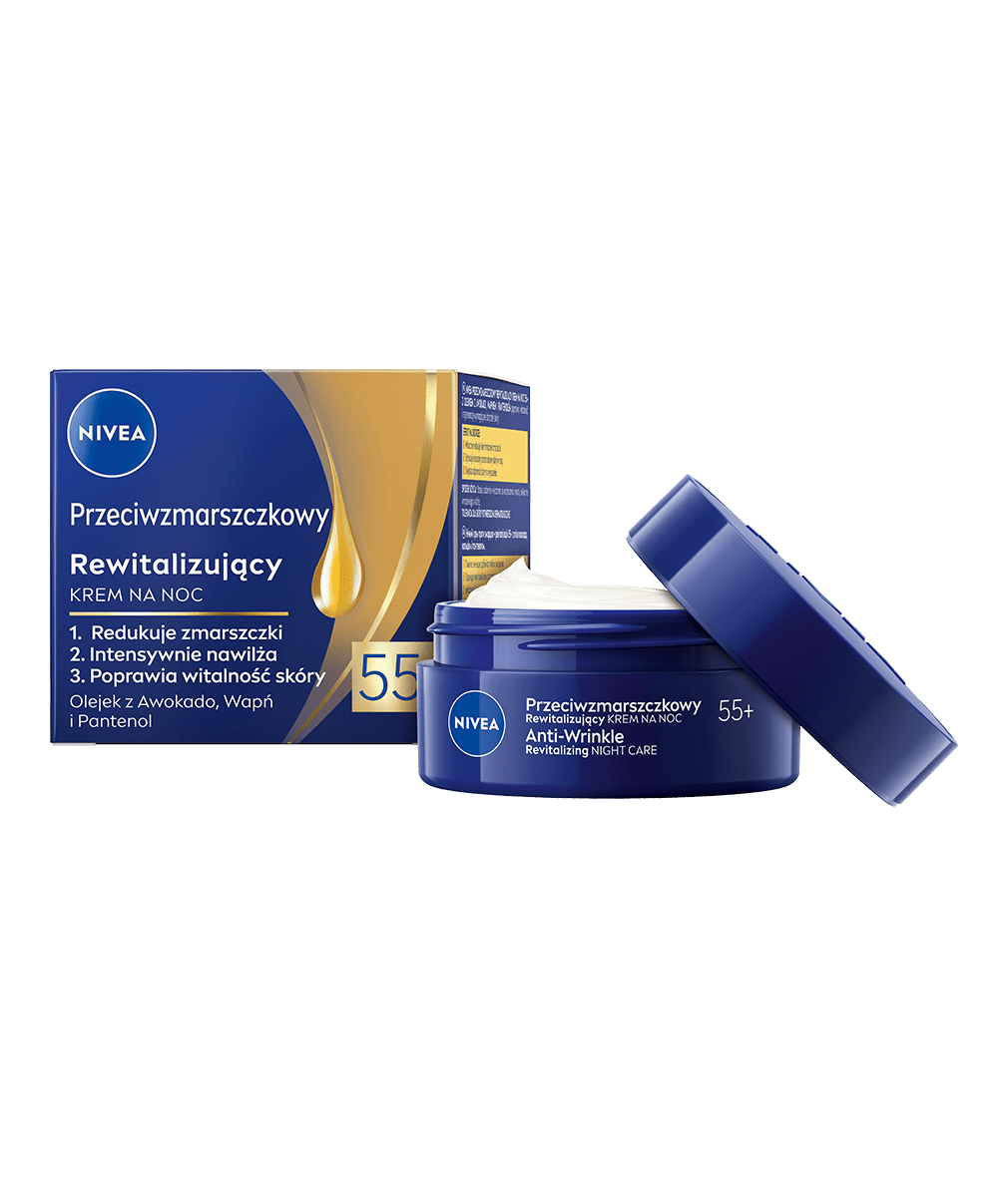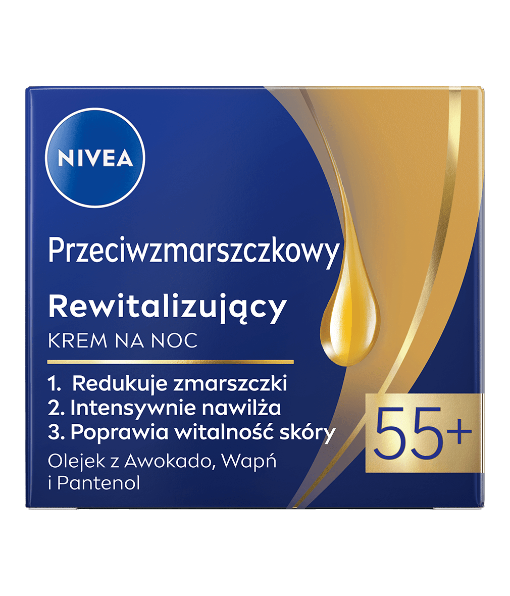 Przeciwzmarszczkowy Rewitalizujący Krem na noc 55+ z Olejkiem z Awokado, Wapniem i Pantenolem to aktywna formuła, która poprawia witalność skóry i walczy nawet z głębokimi zmarszczkami, intensywnie nawilżając oraz zapewniając wsparcie poprzez nocną regenerację skóry dojrzałej.