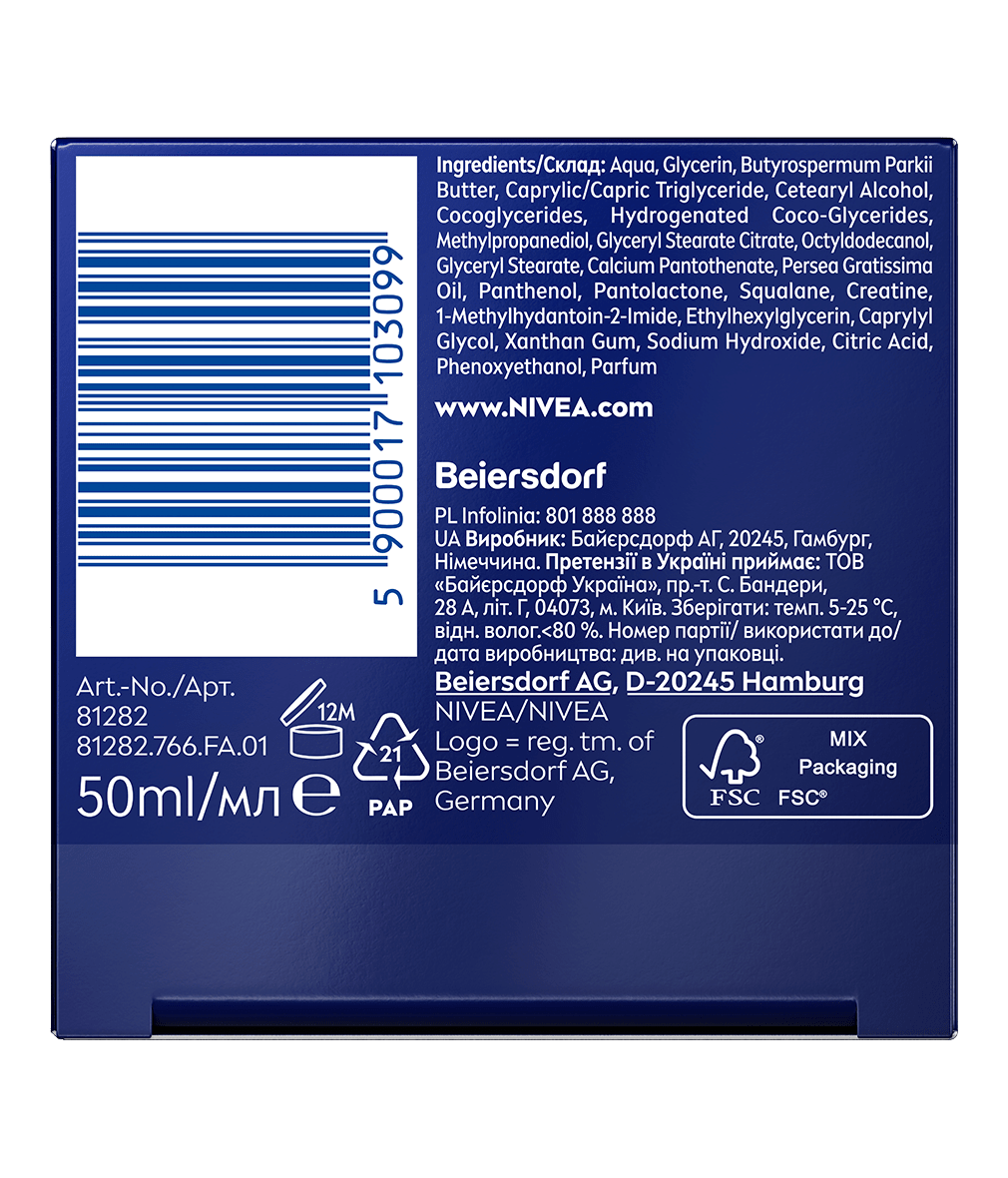 Zawiera: Aqua, Glycerin, Butyrospermum Parkii Butter, Caprylic/Capric Triglyceride, Cetearyl Alcohol, Cocoglycerides, Hydrogenated Coco-Glycerides, Methylpropanediol, Glyceryl Stearate Citrate, Octyldodecanol, Glyceryl Stearate, Calcium Pantothenate, Persea Gratissima Oil, Panthenol, Pantolactone, Squalane, Creatine, 1-Methylhydantoin-2-Imide, Ethylhexylglycerin, Caprylyl Glycol, Xanthan Gum, Sodium Hydroxide, Citric Acid, Phenoxyethanol, Parfum