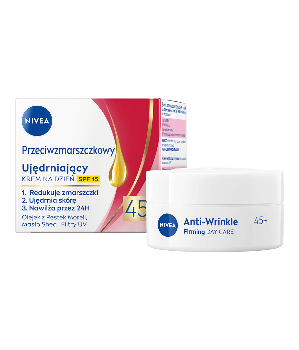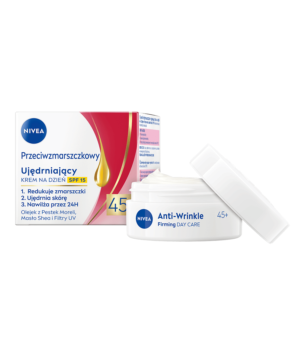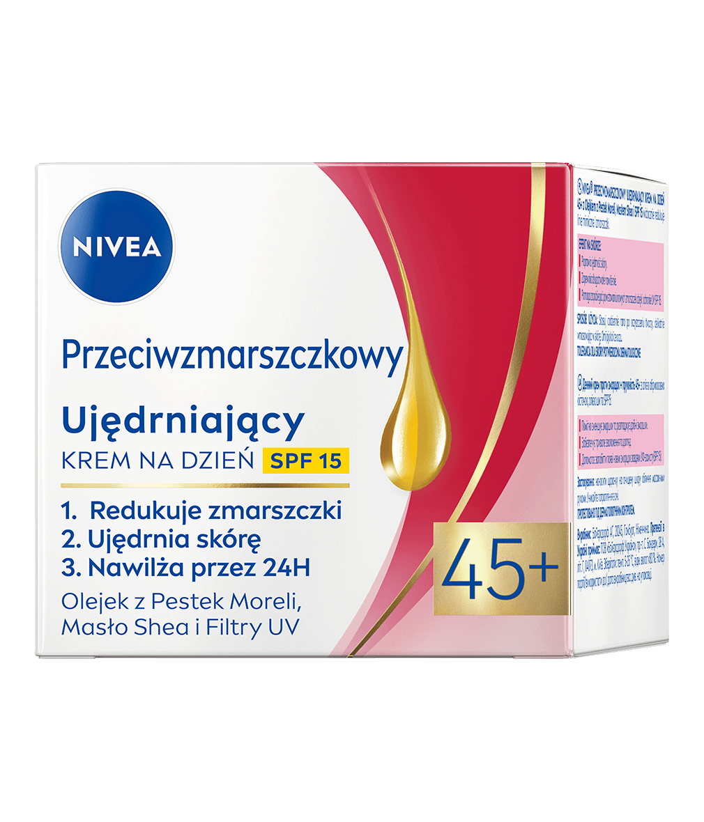 Poznaj Przeciwzmarszczkowy Ujędrniający Krem na dzień +45 z Olejkiem z Pestek Moreli, Masłem Shea i SPF 15 od NIVEA. Redukuje zmarszczki i ujędrnia skórę twarzy. Wyglądaj wyjątkowo i czuj się pewna siebie w każdym wieku!