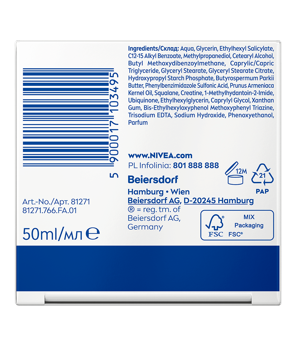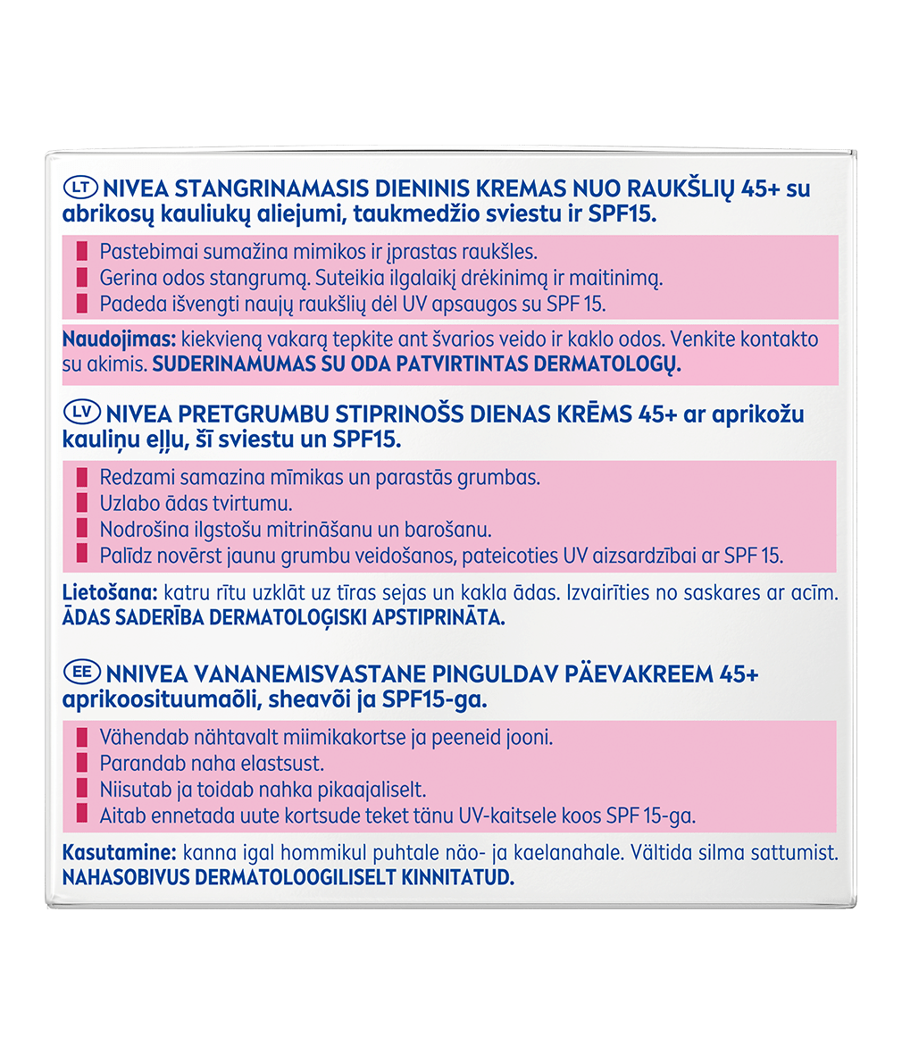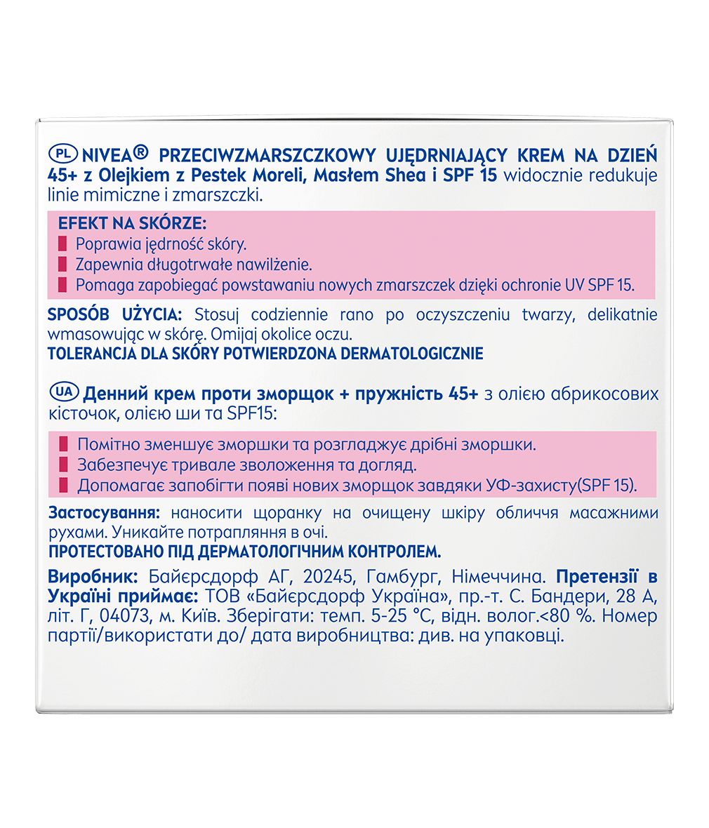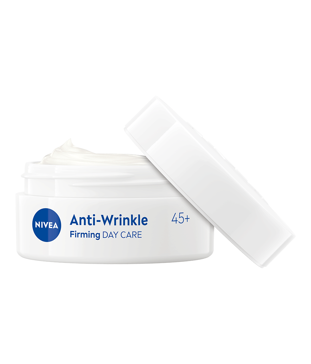 Poznaj Przeciwzmarszczkowy Ujędrniający Krem na dzień +45 z Olejkiem z Pestek Moreli, Masłem Shea i SPF 15 od NIVEA. Redukuje zmarszczki i ujędrnia skórę twarzy. Wyglądaj wyjątkowo i czuj się pewna siebie w każdym wieku!