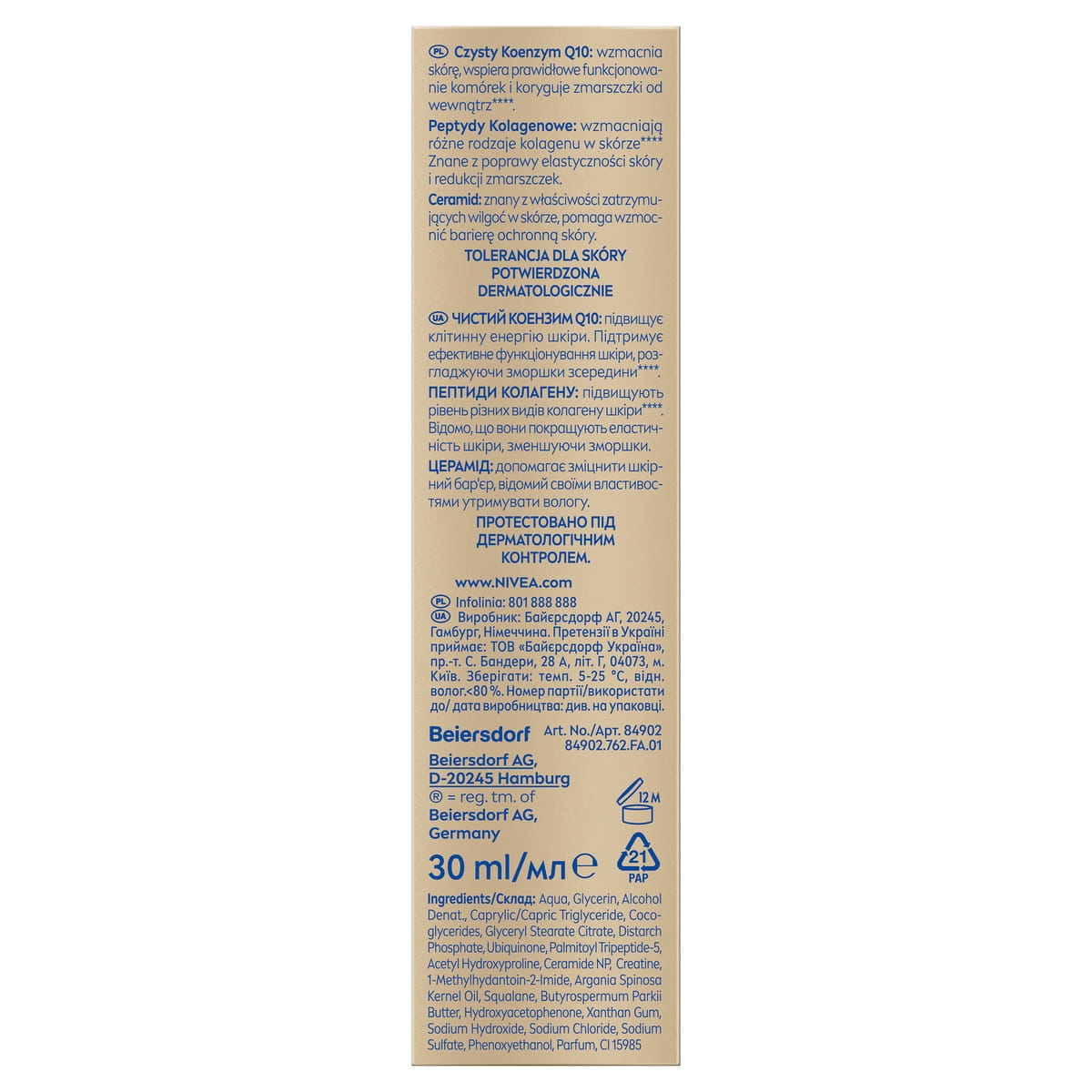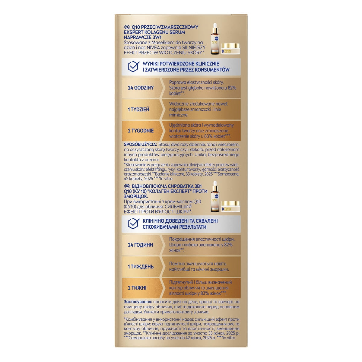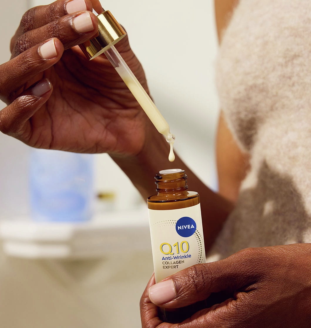 NIVEA Q10 Ekspert Kolagenu Serum naprawcze 3w1, które redukuje głębokie zmarszczki, ujędrnia kontur twarzy i poprawia gęstość skóry. Formuła z Koenzymem Q10, Peptydami Kolagenowymi i Ceramidem dla bardzo suchej, zwiotczałej skóry. Wyniki potwierdzone klinicznie.