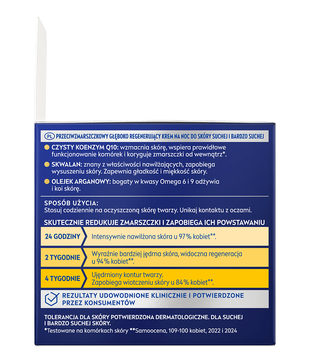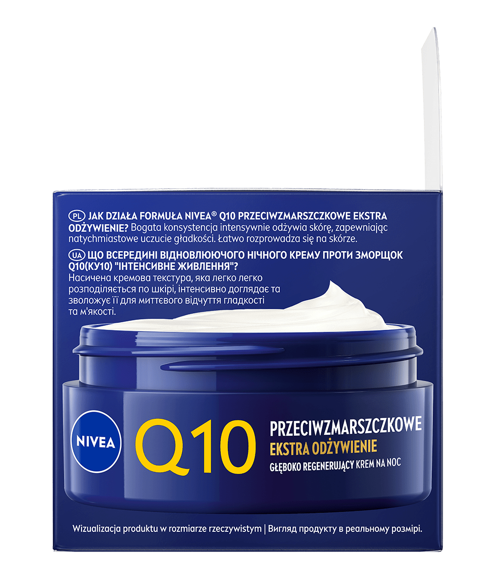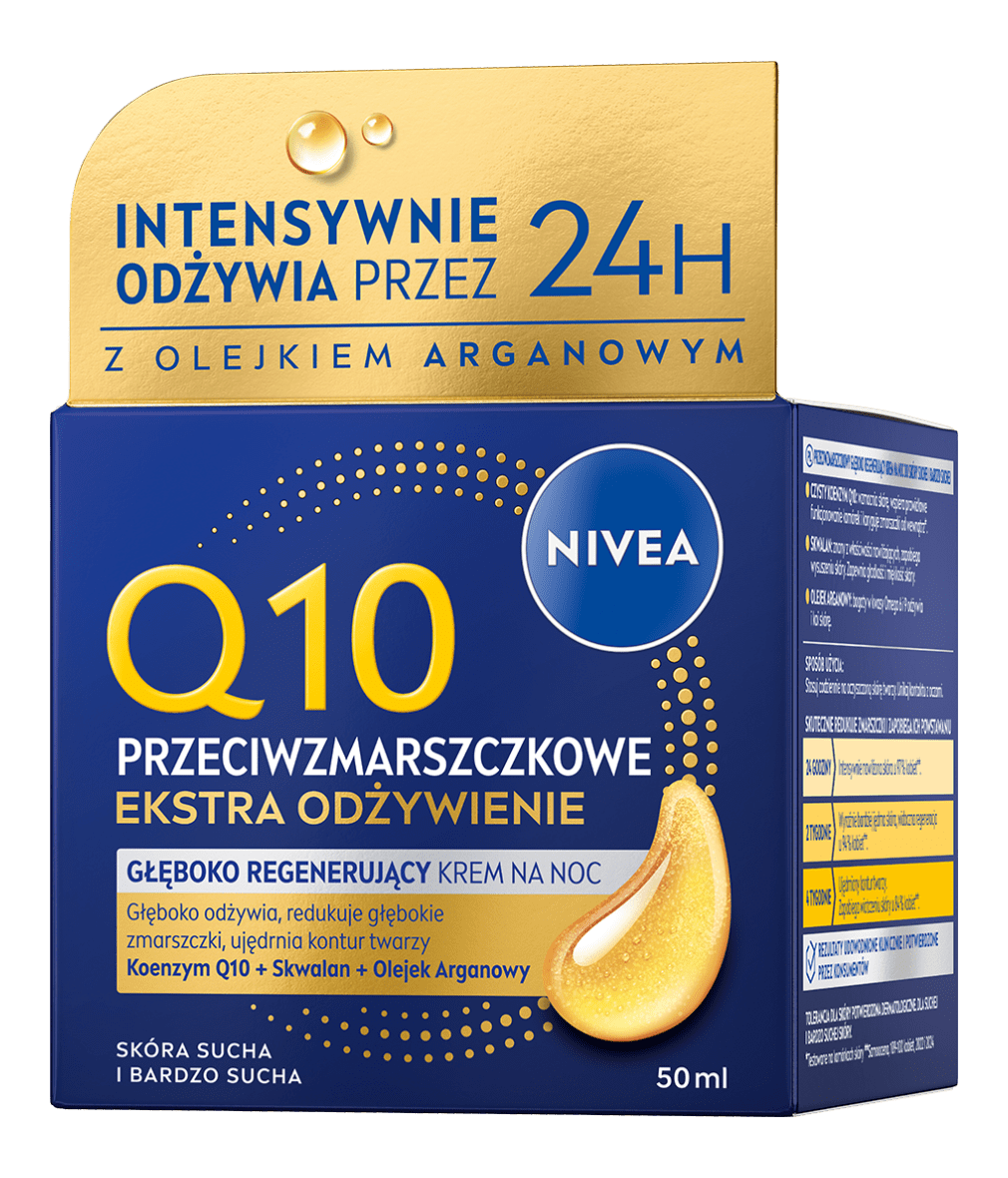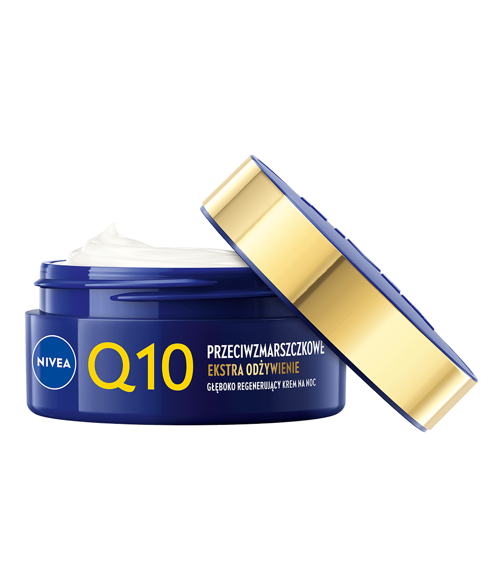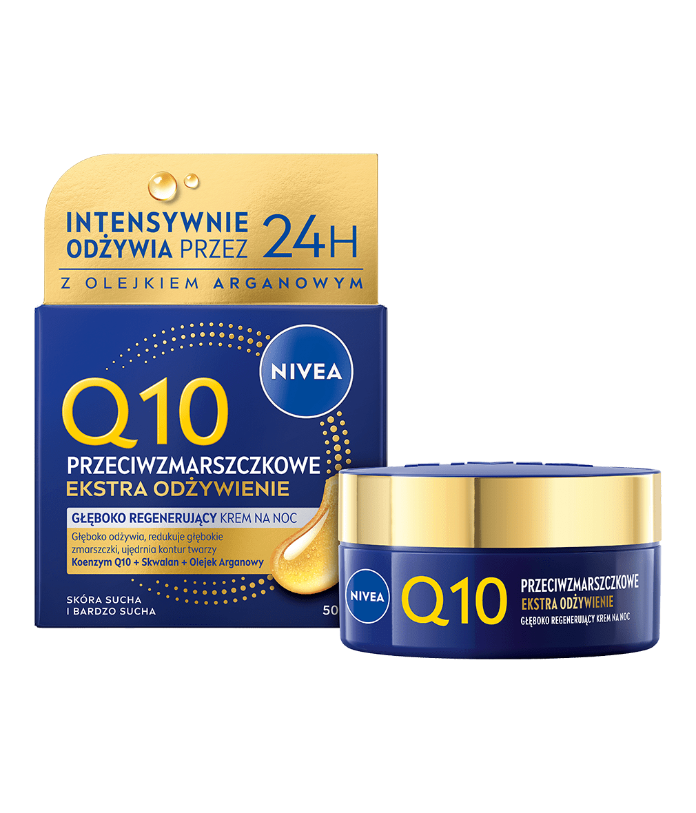 NIVEA Q10 PRZECIWZMARSZCZKOWE EKSTRA ODŻYWIENIE Głęboko Regenerujący krem na noc ujędrni i wzmocni Twoją skórę, a jednocześnie zredukuje głębokie zmarszczki i zapobiegnie wiotczeniu skóry twarzy - wypróbuj już teraz!