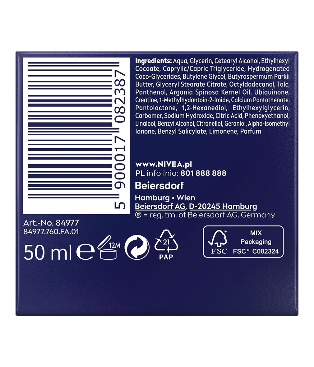 Zawiera: Aqua, Glycerin, Cetearyl Alcohol, Butyrospermum Parkii Butter, Methylpropanediol, Caprylic/Capric Triglyceride, Glyceryl Stearate Citrate, Hydrogenated Coco-Glycerides, Cetearyl Isononanoate, Cocoglycerides, Hydroxypropyl Starch Phosphate, Ubiquinone, Creatine, 1-Methylhydantoin-2-Imide, Panthenol, Pantolactone, Tocopherol, Argania Spinosa Kernel Oil, Vitis Vinifera Seed Oil, Squalane, Ethylhexylglycerin, Hydroxyacetophenone, Xanthan Gum, Sodium Hydroxide, Citric Acid, Phenoxyethanol, Parfum
