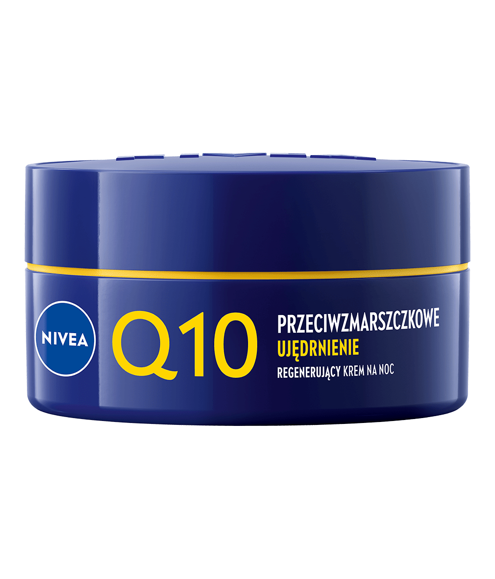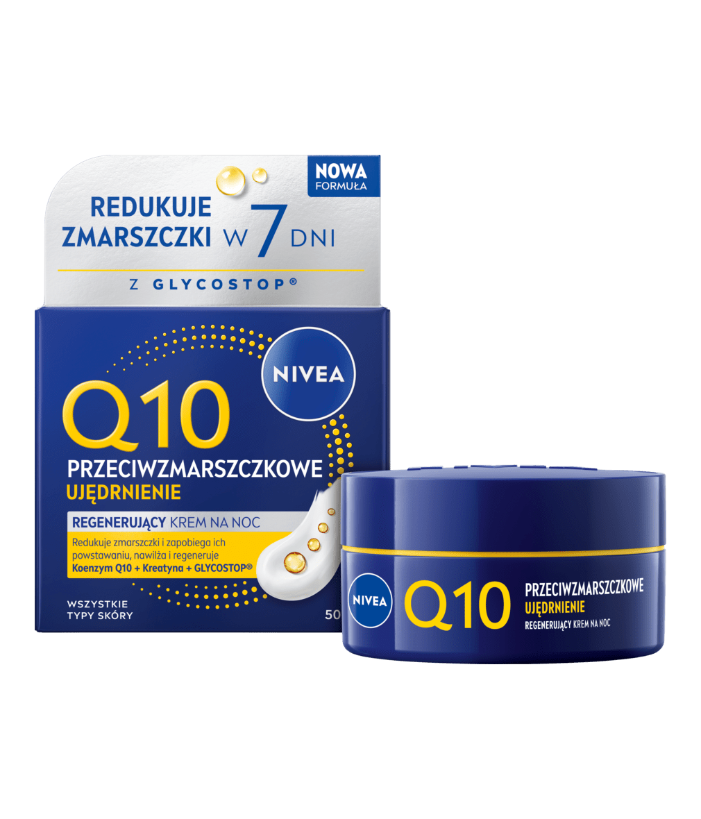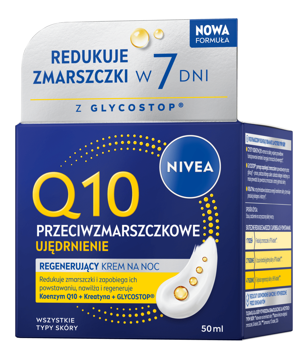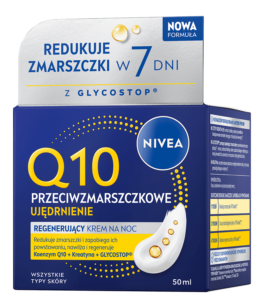 NIVEA Q10 PRZECIZMARSZCZKOWE UJĘDRNIENIE Regenerujący krem na noc dla wszystkich typów skóry zawiera najczystszy, w 100% identyczny jak w skórze Koenzym Q10, Kreatynę i GLYCOSTOP®. Intensywnie pielęgnuje i nawilża, dzięki temu mamy gładką i miękką skórę. Redukuje zmarszczki już w 7 dni z GLYCOSTOP®!